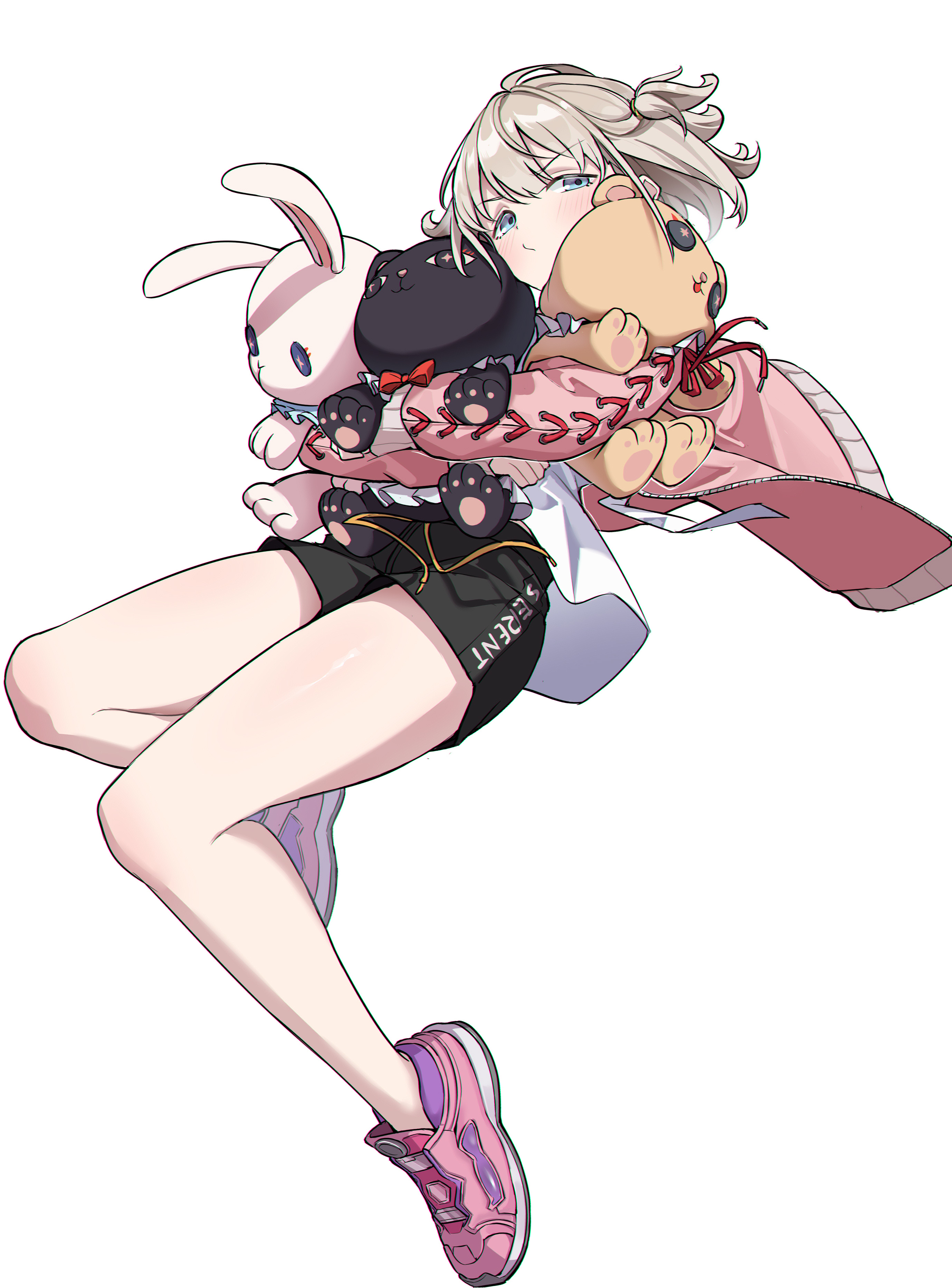 1girl absurdres bare_legs black_shorts blue_eyes commentary full_body grey_hair highres hugging_object idolmaster idolmaster_shiny_colors jacket looking_at_viewer pink_jacket pink_shoes serizawa_asahi shoes short_hair shorts sneakers solo stuffed_animal stuffed_toy tamago_(eva1314056) thighs white_background