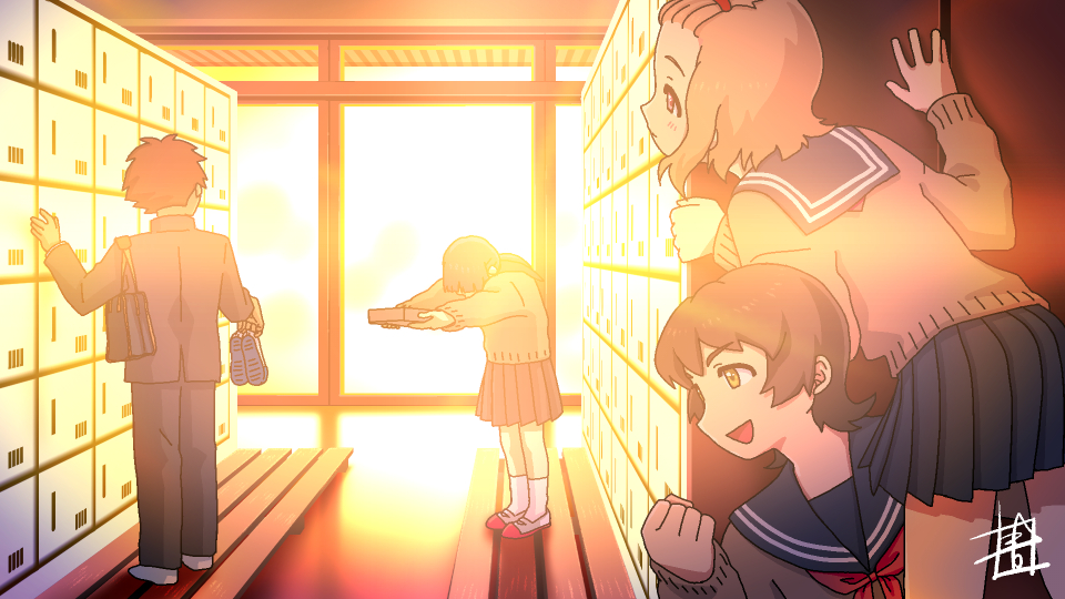1boy 3girls :d aoiyuya bag bangs_pinned_back black_hair bowing brown_eyes brown_hair clenched_hand confession gakuran gift hair_ornament hairclip holding holding_shoes holding_unworn_clothes long_hair low_twintails multiple_girls open_mouth original outstretched_arms peeking_out pink_eyes pink_hair pleated_skirt school school_bag school_uniform serafuku shoes short_hair skirt smile sunlight sunset sweater twintails unworn_shoes v-shaped_eyebrows valentine