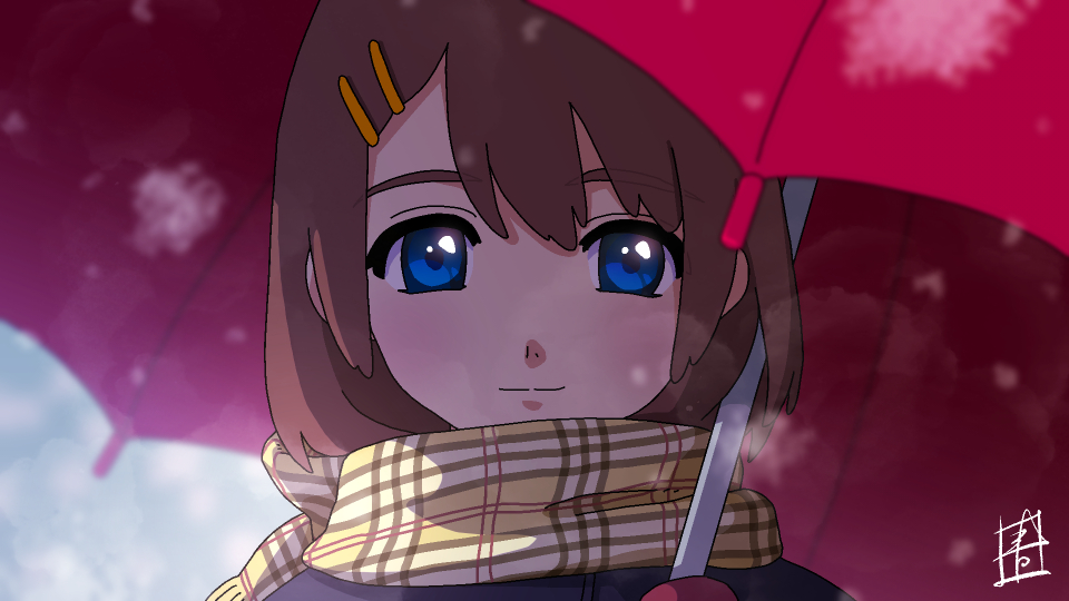 1girl aoiyuya blue_eyes blush brown_hair hair_ornament hairclip holding holding_umbrella looking_at_viewer original plaid_clothes plaid_scarf scarf short_hair smile snowing solo umbrella winter