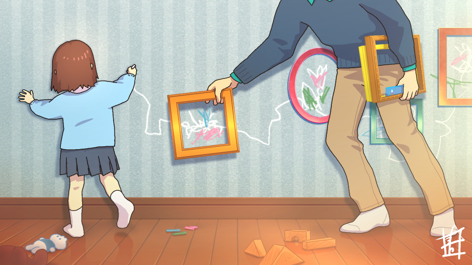 1boy 1girl aoiyuya chalk child drawing father_and_child father_and_daughter holding holding_chalk indoors no_shoes original parent_and_child picture_frame pleated_skirt skirt socks stuffed_animal stuffed_toy sweater toy toy_block