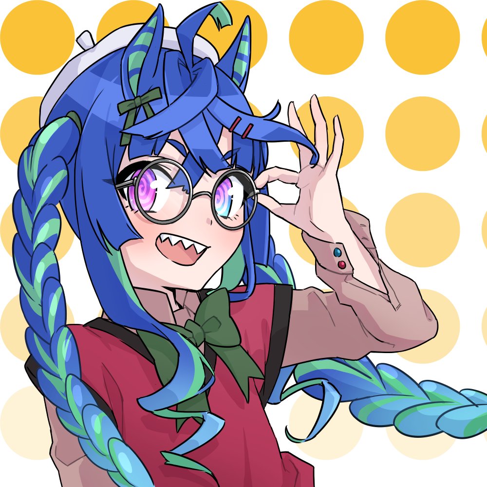 1girl @_@ adjusting_eyewear ahoge alternate_costume alternate_hairstyle animal_ears beret blue_hair bow bowtie braid brown_shirt crossed_bangs glasses green_bow green_bowtie hair_ornament hairclip hand_up hat horse_ears long_hair long_sleeves looking_at_viewer modjiro multicolored_eyes open_mouth purple_eyes round_eyewear sharp_teeth shirt smile solo teeth twin_braids twin_turbo_(umamusume) umamusume upper_body upper_teeth_only v-neck white_hat