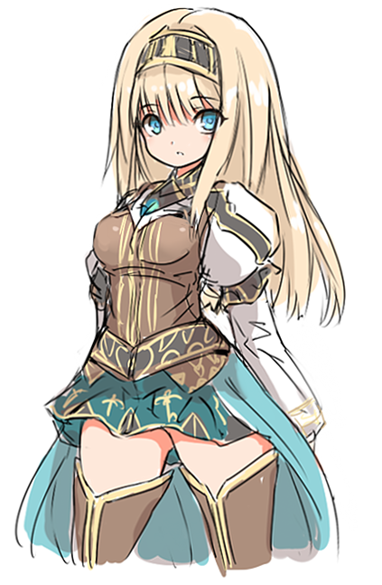 1girl alicia_(valkyrie_profile_2) blonde_hair blue_eyes breasts hairband karukan_(monjya) long_hair looking_at_viewer puffy_sleeves silmeria_valkyrie simple_background skirt solo standing thighhighs valkyrie_profile_(series) valkyrie_profile_2:_silmeria white_background