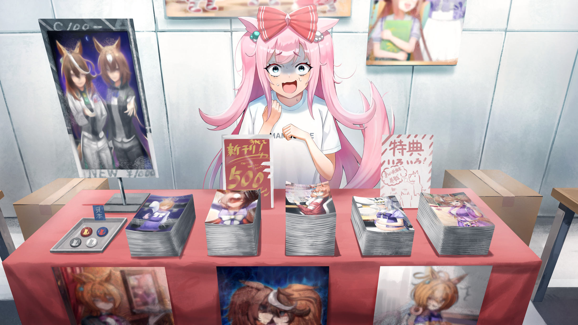 1girl agnes_digital_(umamusume) animal_ears blue_eyes bow casual comiket_100 commentary drawing hair_bow hair_ornament highres horse_ears horse_girl horse_tail manga_(object) messy_hair motusii pink_hair poster_(object) solo_focus surprised sweatdrop tail umamusume