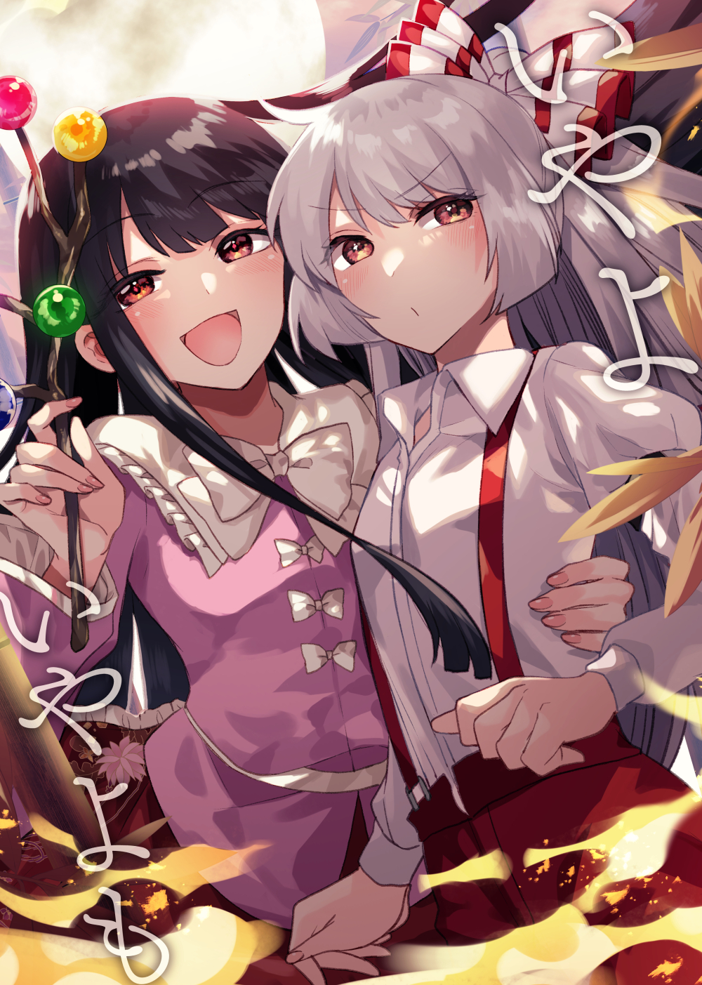2girls alternate_eye_color bamboo bamboo_forest black_hair blouse blush bow bowtie branch breasts brown_eyes brown_flower collared_shirt comiket_100 commentary_request cover cover_page eyes_visible_through_hair fingernails fire floral_print flower forest fujiwara_no_mokou grey_bow grey_bowtie grey_hair grey_shirt hair_between_eyes hair_bow hand_up hands_up highres houraisan_kaguya jeweled_branch_of_hourai juliet_sleeves katayama_kei leaf leaf_print long_fingernails long_hair long_sleeves looking_to_the_side medium_breasts moon multicolored_bow multiple_girls nail_polish nature open_mouth pants pink_flower pink_nails pink_shirt puffy_long_sleeves puffy_sleeves red_bow red_eyes red_pants red_skirt shirt skirt smile standing suspenders tongue touhou v-shaped_eyebrows wide_sleeves