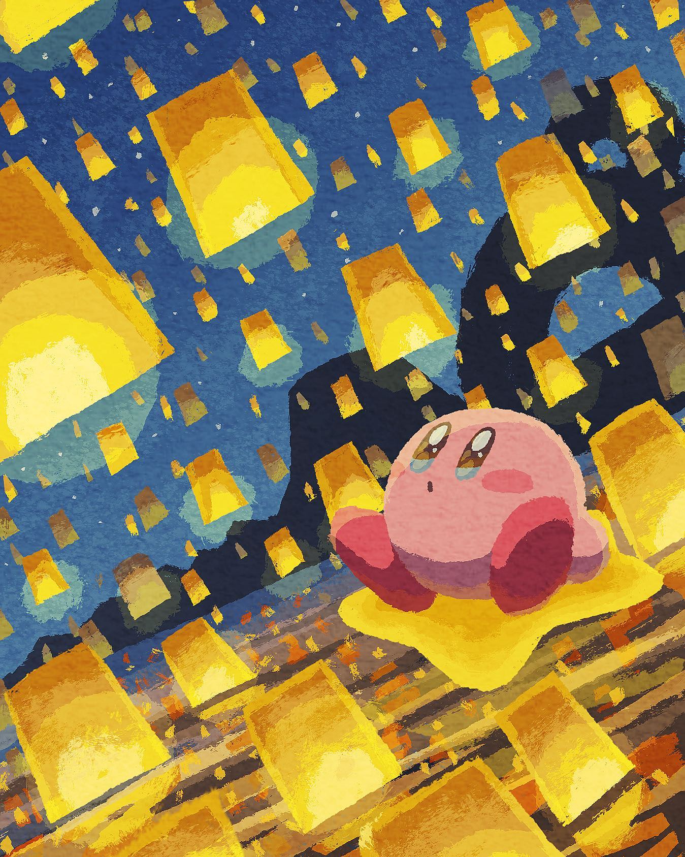 colored_skin commentary flare floating highres kirby kirby_(series) lantern lens_flare looking_up miclot mountain night nintendo no_humans paper_lantern pink_skin red_footwear sky sky_lantern sparkling_eyes star_(sky) star_(symbol)