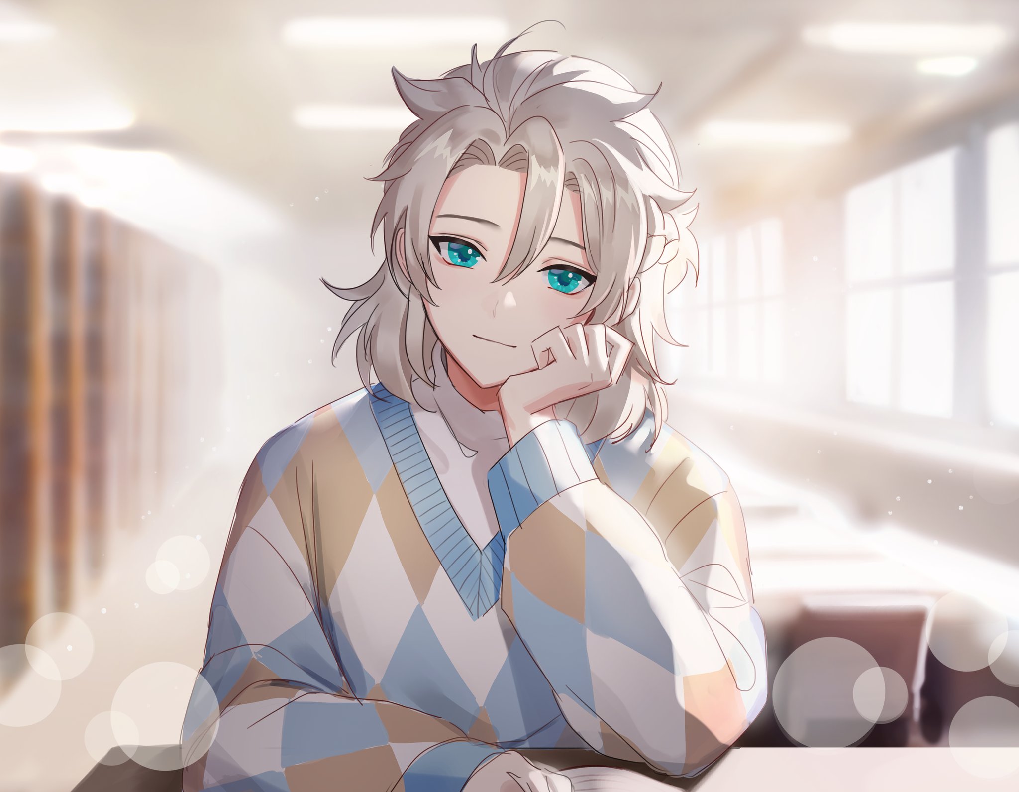 0jae 1boy albedo_(genshin_impact) alternate_costume aqua_eyes blonde_hair genshin_impact grey_hair highres library long_hair long_sleeves looking_at_viewer male_focus shirt smile solo white_shirt