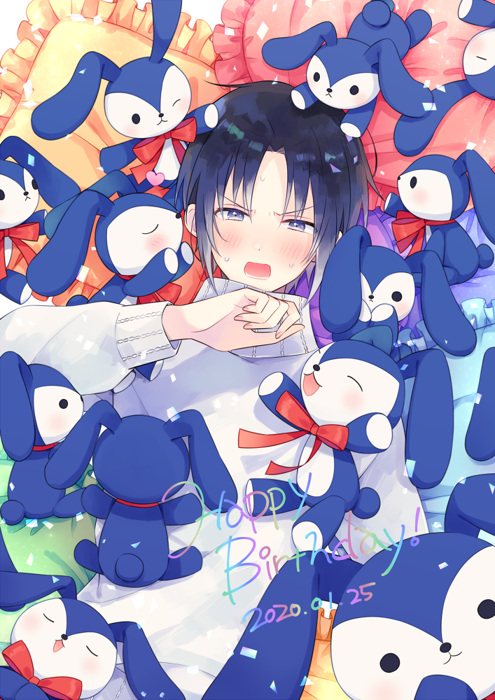 1boy aged_down bed bishounen black_hair blue_hair blush child confetti gradient_hair grey_eyes happy heart idolish7 izumi_iori looking_at_viewer lying male_focus multicolored_hair open_mouth pillow short_hair solo stuffed_toy sweatdrop sweater tayako v-shaped_eyebrows