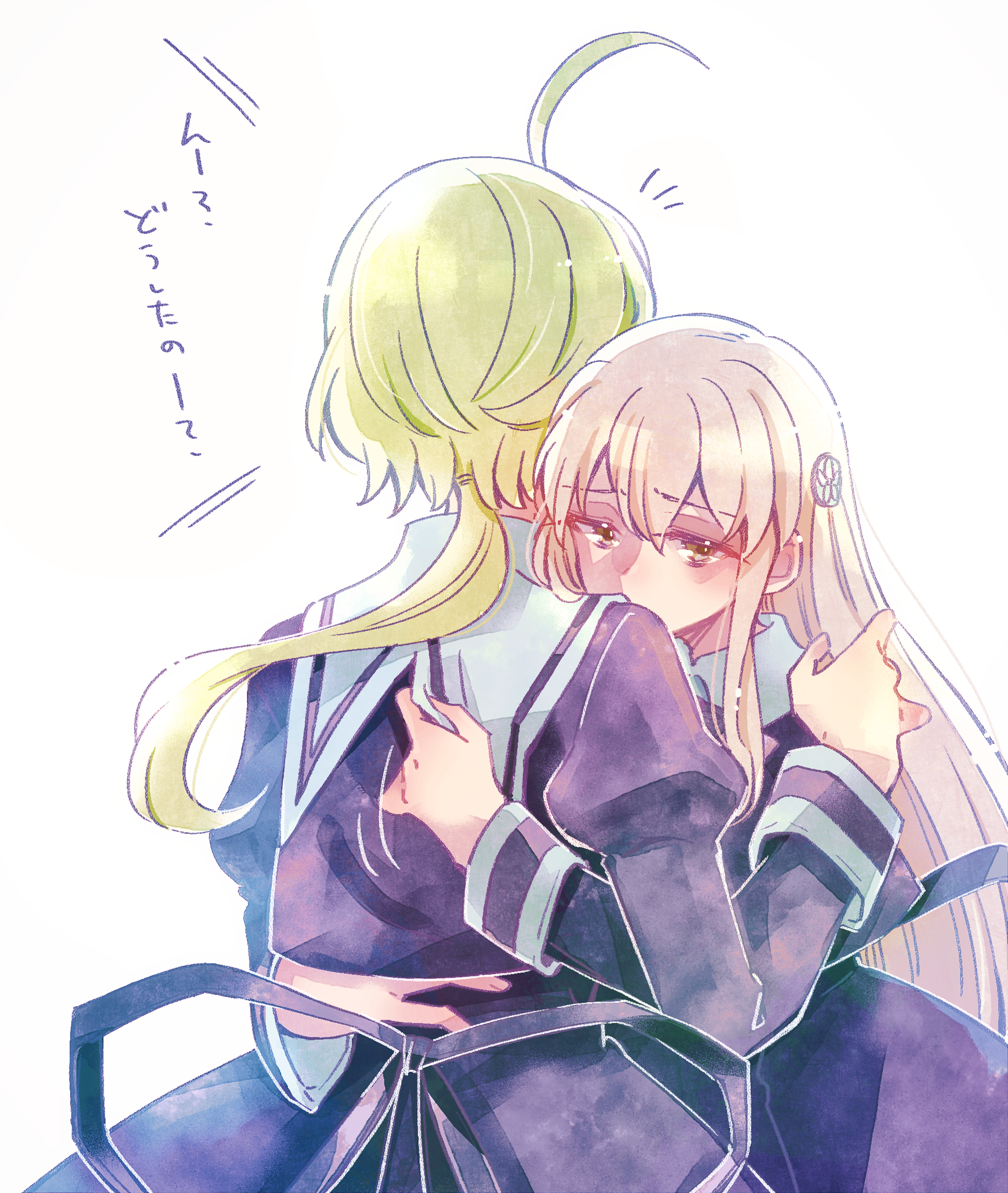 2girls ahoge amano_soraha assault_lily black_skirt blonde_hair brown_eyes covered_mouth cropped_jacket egawa_kusumi facing_away grey_hair hair_between_eyes hand_up hands_up head_on_another's_shoulder heads_together high-waist_skirt highres hug juliet_sleeves long_hair long_sleeves looking_away low_ponytail multiple_girls notice_lines ponytail puffy_sleeves school_uniform simple_background skirt sorato_(astllatte) standing very_long_hair white_background yuri yurigaoka_girls_academy_school_uniform
