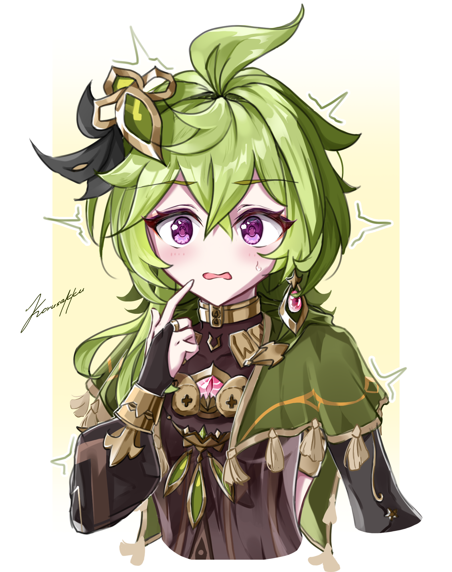 1girl ahoge blush capelet collei_(genshin_impact) crossed_bangs earrings genshin_impact gloves green_capelet green_hair hair_between_eyes hair_ornament highres jewelry korusakku purple_eyes short_hair solo surprised white_background