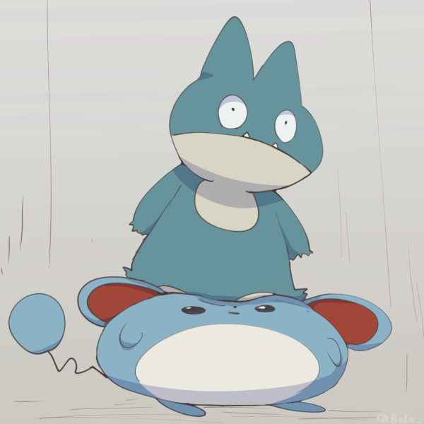 animal_focus arms_at_sides black_eyes boke-chan closed_mouth fangs fangs_out full_body gen_2_pokemon gen_4_pokemon grey_background marill munchlax nintendo no_humans on_head pokemon pokemon_(creature) pokemon_on_head simple_background sketch squishing standing