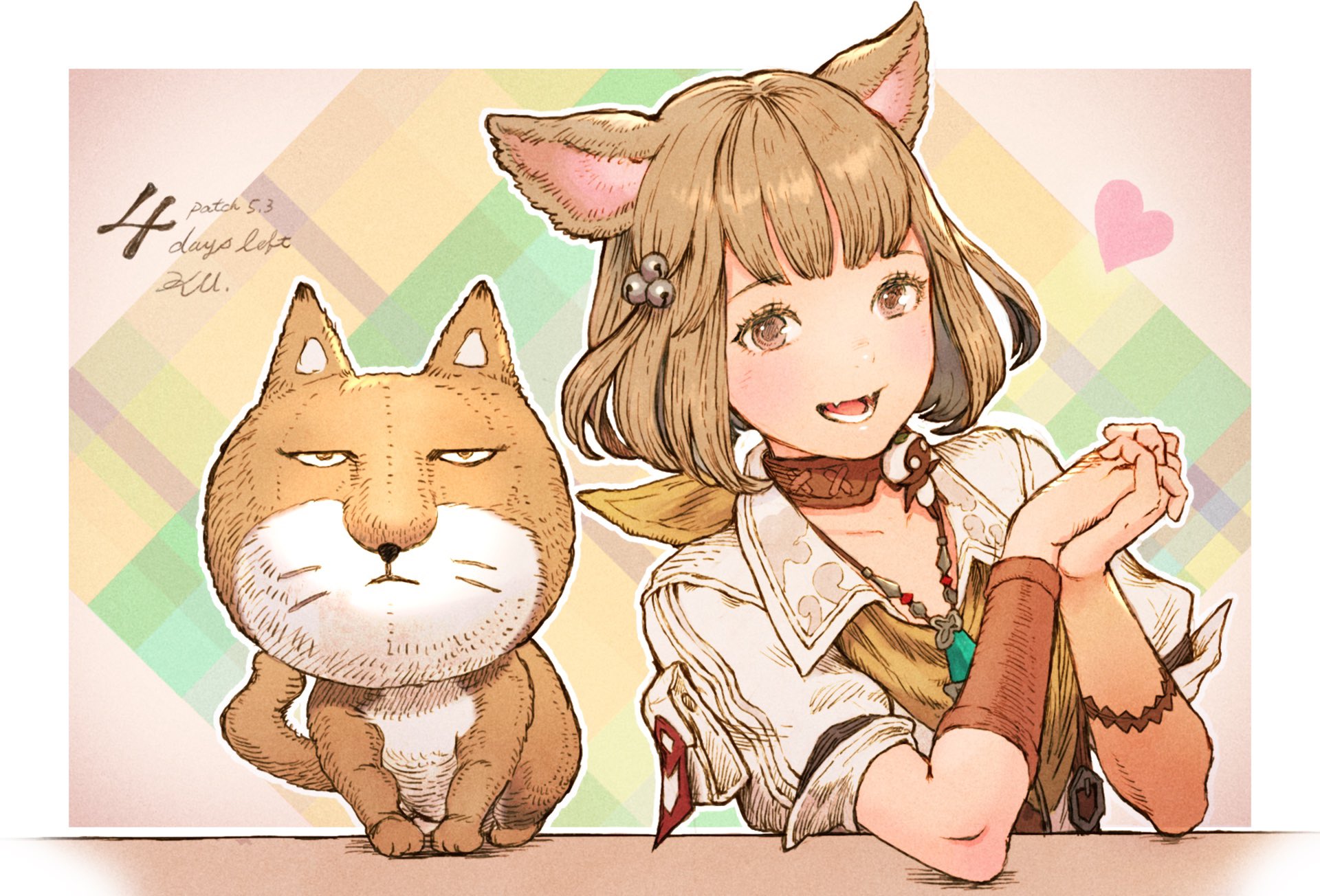 1girl :d animal_ears bell belt belt_buckle blunt_bangs border brown_collar brown_eyes brown_hair buckle cat_ears child collar collarbone countdown elbow_rest fangs final_fantasy final_fantasy_xiv fox hair_bell hair_ornament hands_up hatching_(texture) heart highres interlocked_fingers jacket jewelry jitome khloe_aliapoh kuroimori looking_at_viewer mandragora_(final_fantasy) miqo'te multicolored_background open_mouth outline outside_border own_hands_clasped own_hands_together pendant pouch scarf short_hair smile solo square_enix tibetan_sand_fox upper_body white_border white_jacket white_outline yellow_scarf