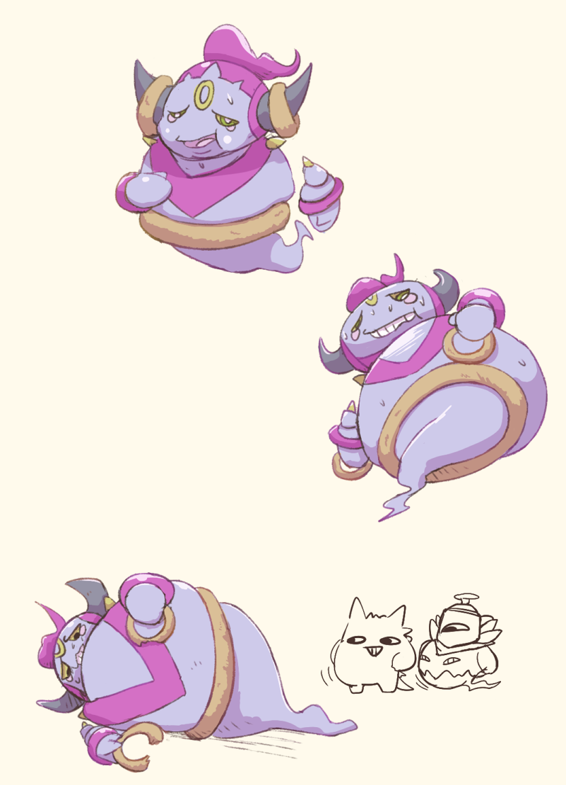 blush_stickers boke-chan bright_pupils colored_sclera dusknoir facial_mark fat food food_bite forehead_mark gen_1_pokemon gen_4_pokemon gen_6_pokemon gengar green_eyes half-closed_eyes high_ponytail holding holding_food hoopa hoopa_(confined) legendary_pokemon lying multiple_views mythical_pokemon nintendo no_humans on_side onion_rings open_mouth pokemon pokemon_(creature) ponytail purple_hair short_hair simple_background sweat teeth white_pupils yellow_eyes yellow_sclera