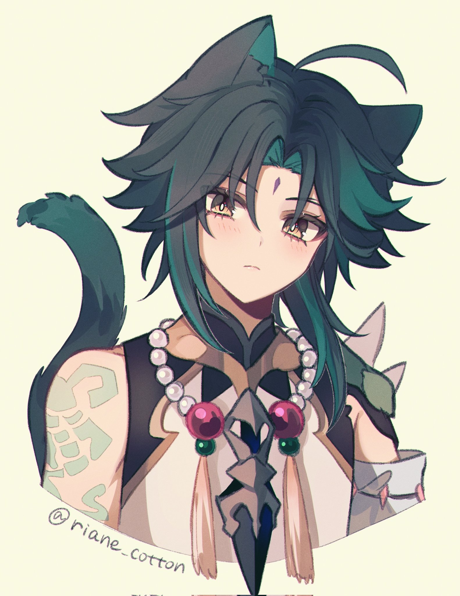 1boy :< ahoge animal_ear_fluff animal_ears arm_tattoo artist_name asymmetrical_clothes bare_shoulders bead_necklace beads blush cat_boy cat_ears cat_tail closed_mouth commentary_request cropped_torso detached_sleeves eyelashes facial_mark forehead_mark genshin_impact gold_trim green_background green_hair head_tilt highres jewelry looking_at_viewer male_focus multicolored_hair necklace parted_bangs riane_cotton shirt short_hair short_hair_with_long_locks shoulder_spikes sidelocks single_detached_sleeve sleeveless sleeveless_shirt solo spikes streaked_hair tail tassel tattoo twitter_username upper_body white_shirt xiao_(genshin_impact) yellow_eyes