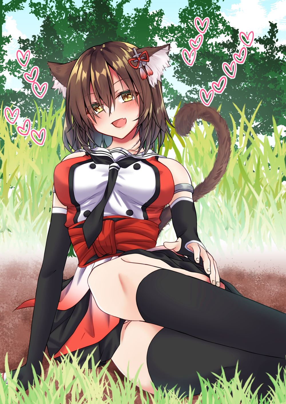 1girl animal_ears black_gloves black_neckerchief black_skirt black_socks brown_eyes brown_hair buttons cat_ears cat_tail commentary_request double-breasted elbow_gloves fingerless_gloves gloves grass highres izumo_ayuka kantai_collection looking_at_viewer neckerchief school_uniform sendai_(kancolle) sendai_kai_ni_(kancolle) serafuku shirt sitting skirt sleeveless sleeveless_shirt socks solo tail two_side_up yokozuwari