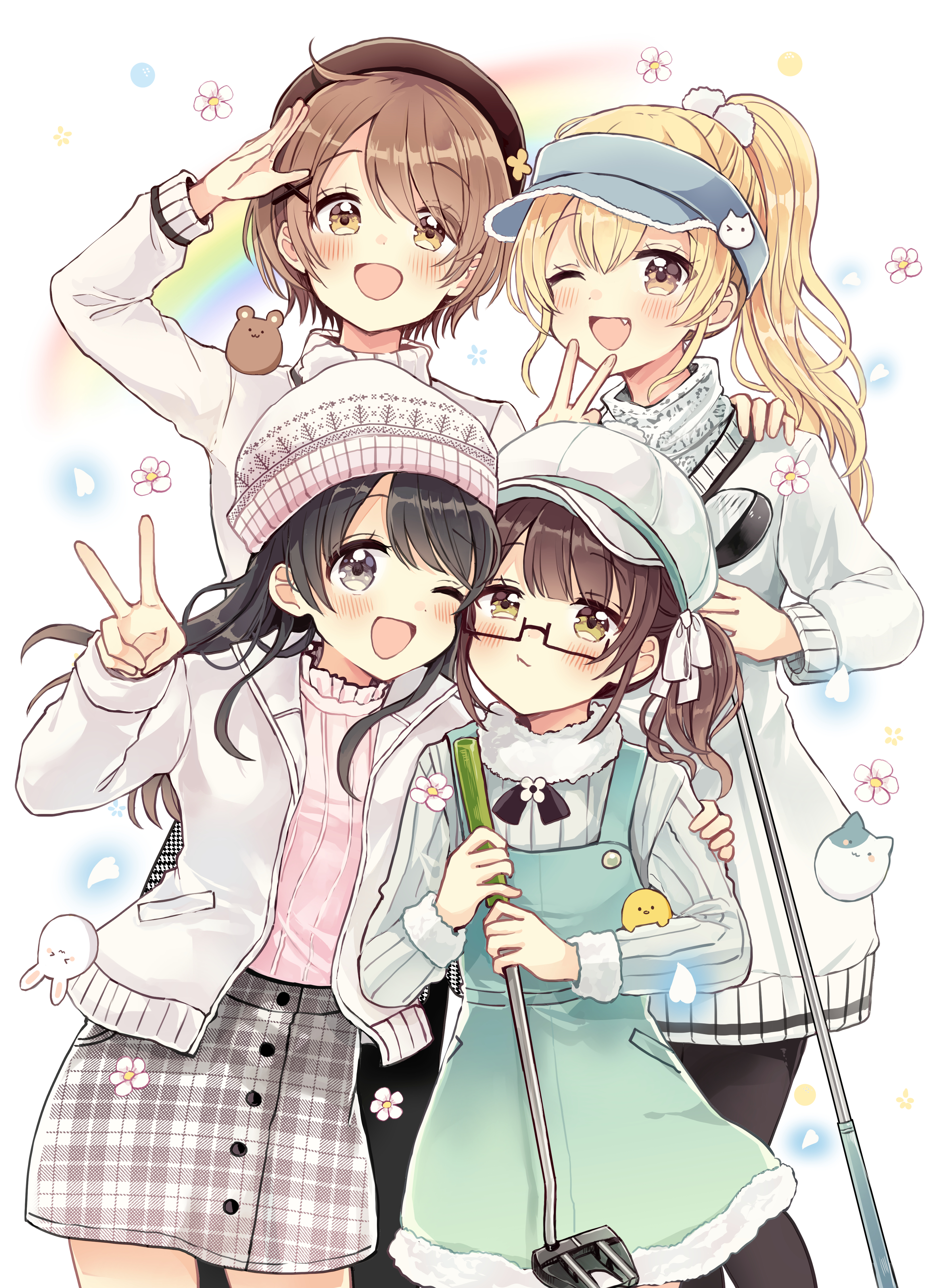 4girls ;d absurdres beanie beret black-framed_eyewear black_hair black_pantyhose blonde_hair blue_dress blue_headwear blush brown_eyes brown_hair brown_headwear newsboy_cap character_request commentary_request dress fang fur-trimmed_dress fur-trimmed_sleeves fur_trim glasses golf_club grey_eyes grey_skirt hand_on_another's_shoulder hat highres holding jacket long_sleeves multiple_girls official_art one_eye_closed open_mouth pantyhose pink_shirt plaid_clothes plaid_skirt ponytail rainbow rectangular_eyewear ribbed_shirt sakura_oriko school_uniform semi-rimless_eyewear shirt skirt sleeveless sleeveless_dress smile sweater swing!! turtleneck turtleneck_sweater under-rim_eyewear visor_cap white_background white_headwear white_jacket white_sweater