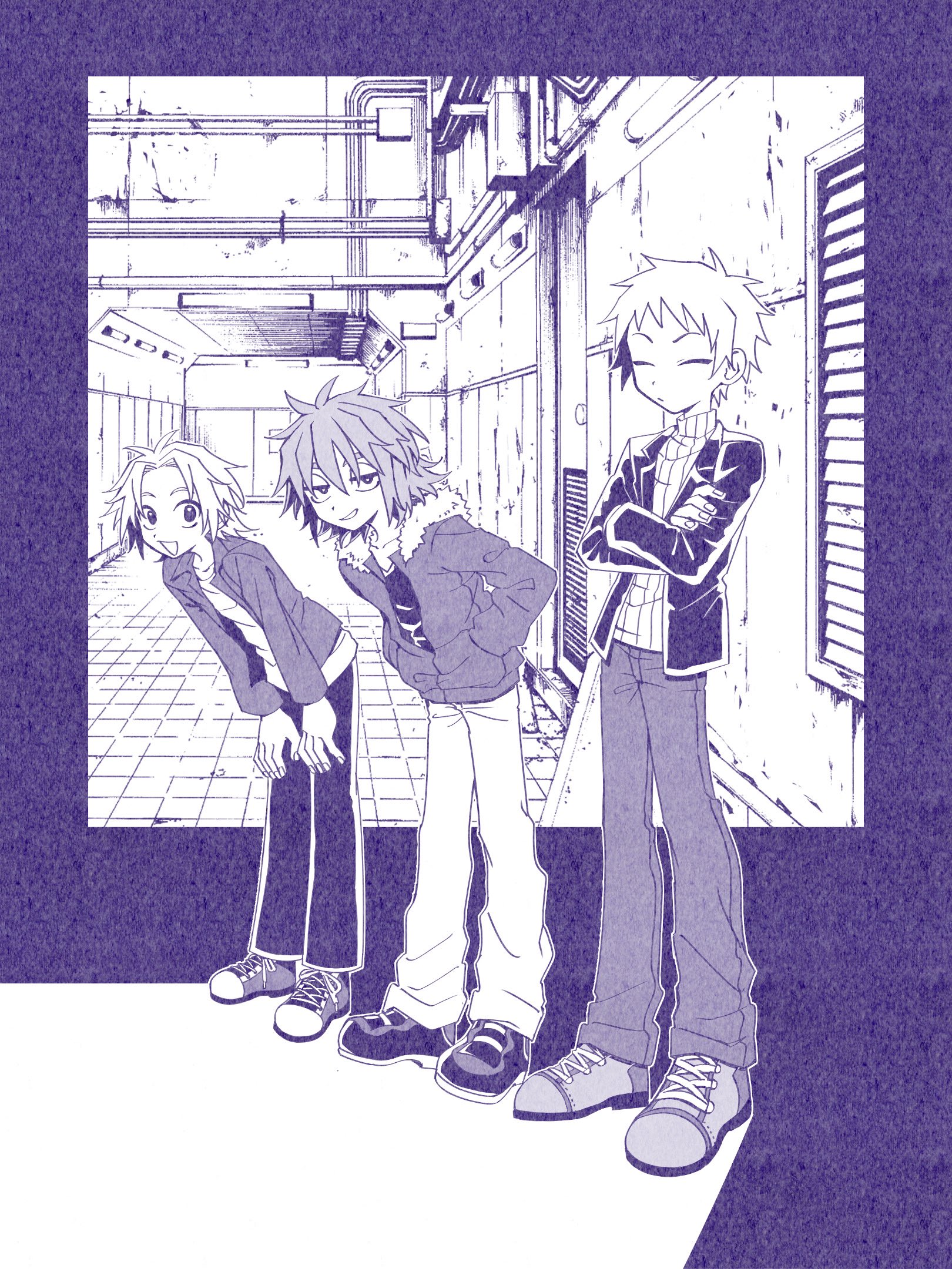 3boys :d atou_haruki closed_eyes closed_mouth crossed_arms full_body fur-trimmed_jacket fur_trim furry grin hands_in_pockets hands_on_own_thighs highres hood hood_down hooded_jacket isoi_reiji jacket leaning_forward male_focus medium_hair monochrome multiple_boys open_clothes open_jacket open_mouth pants parted_bangs partially_unzipped ribbed_sweater safe3133 saibou_shinkyoku sanpaku shinano_eiji shirt shoelaces shoes short_hair smile sneakers standing sweater turtleneck turtleneck_sweater