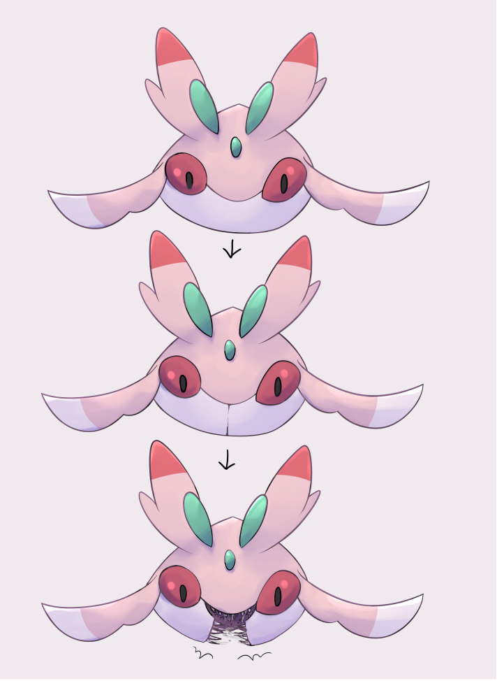animal_focus arrow_(symbol) black_eyes boke-chan colored_sclera gen_7_pokemon grey_background looking_at_viewer lurantis nintendo no_humans no_mouth open_mouth pokemon pokemon_(creature) portrait red_sclera saliva sequential sharp_teeth simple_background straight-on teeth