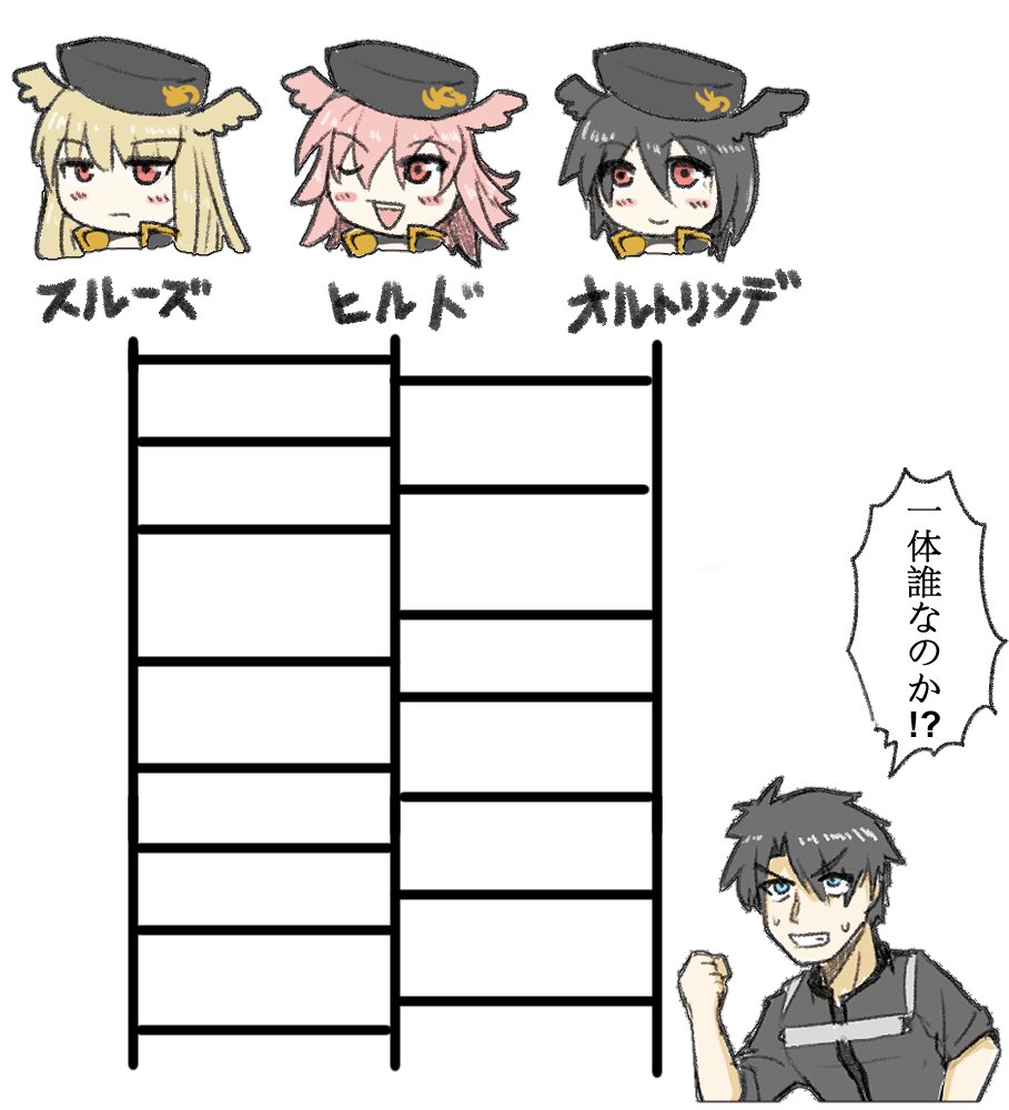 1boy 3girls black_hair blonde_hair commentary eyebrows_hidden_by_hair fate/grand_order fate_(series) fujimaru_ritsuka_(male) hair_between_eyes hildr_(fate) hildr_(swimsuit_assassin)_(fate) ladder_lottery long_hair multiple_girls one_eye_closed open_mouth ortlinde_(fate) ortlinde_(swimsuit_assassin)_(fate) pink_hair pointy_ears red_eyes short_hair smile srwbobobi thrud_(fate) thrud_(swimsuit_assassin)_(fate) translated upper_body valkyrie_(fate)