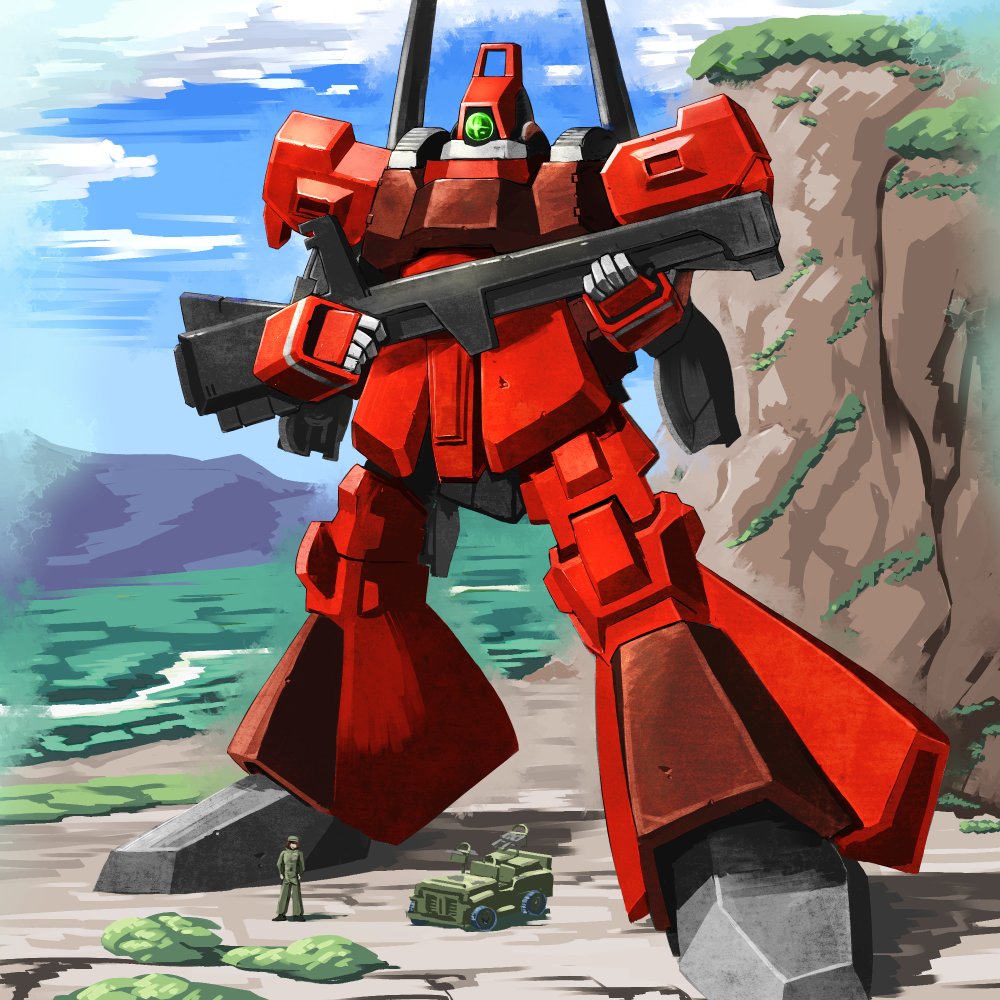 car cloud gun gundam holding holding_gun holding_weapon mecha military military_vehicle motor_vehicle rick_dias robot umigarasu_(kitsune1963) weapon zeta_gundam
