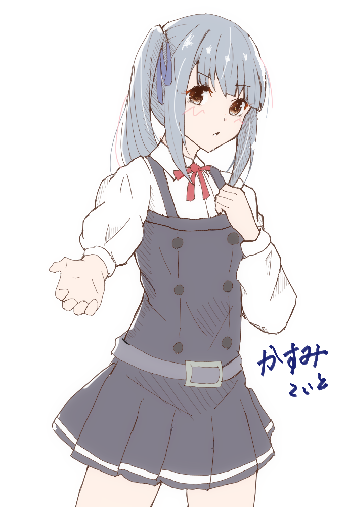 blue_ribbon brown_eyes dress grey_hair grey_ribbon hair_ribbon kantai_collection kasumi_(kancolle) kasumi_kai_ni_(kancolle) koito_(shi_marl_marl) long_hair long_sleeves looking_at_viewer neck_ribbon pinafore_dress red_ribbon ribbon shirt side_ponytail simple_background sleeveless sleeveless_dress white_background white_shirt