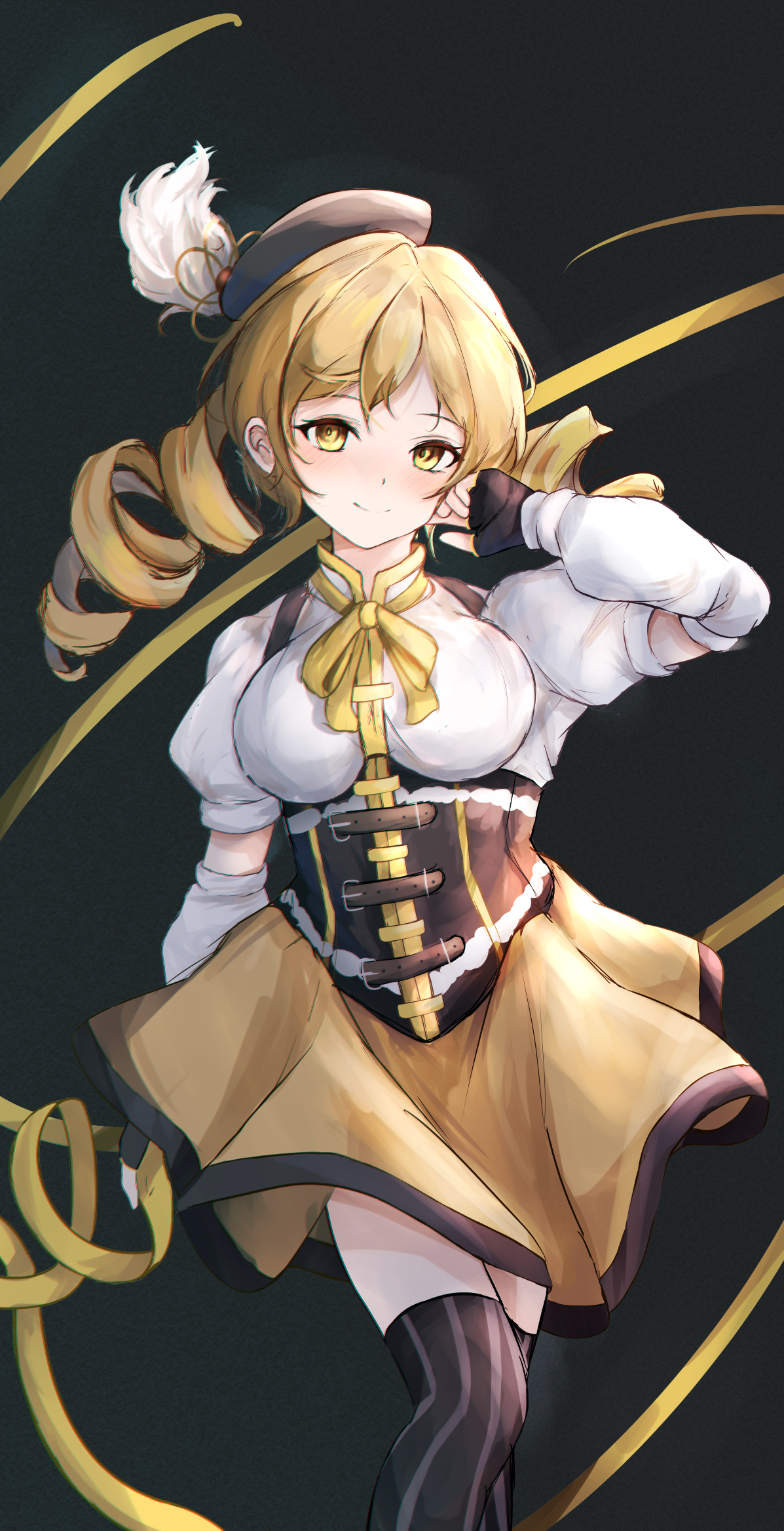 1girl black_background black_headwear black_thighhighs blonde_hair breasts closed_mouth drill_hair highres large_breasts long_hair looking_at_viewer mahou_shoujo_madoka_magica mahou_shoujo_madoka_magica_(anime) orchid_(orukido) simple_background skirt smile striped_clothes striped_thighhighs thighhighs tomoe_mami tomoe_mami_(magical_girl) twin_drills vertical-striped_clothes vertical-striped_thighhighs yellow_eyes yellow_skirt