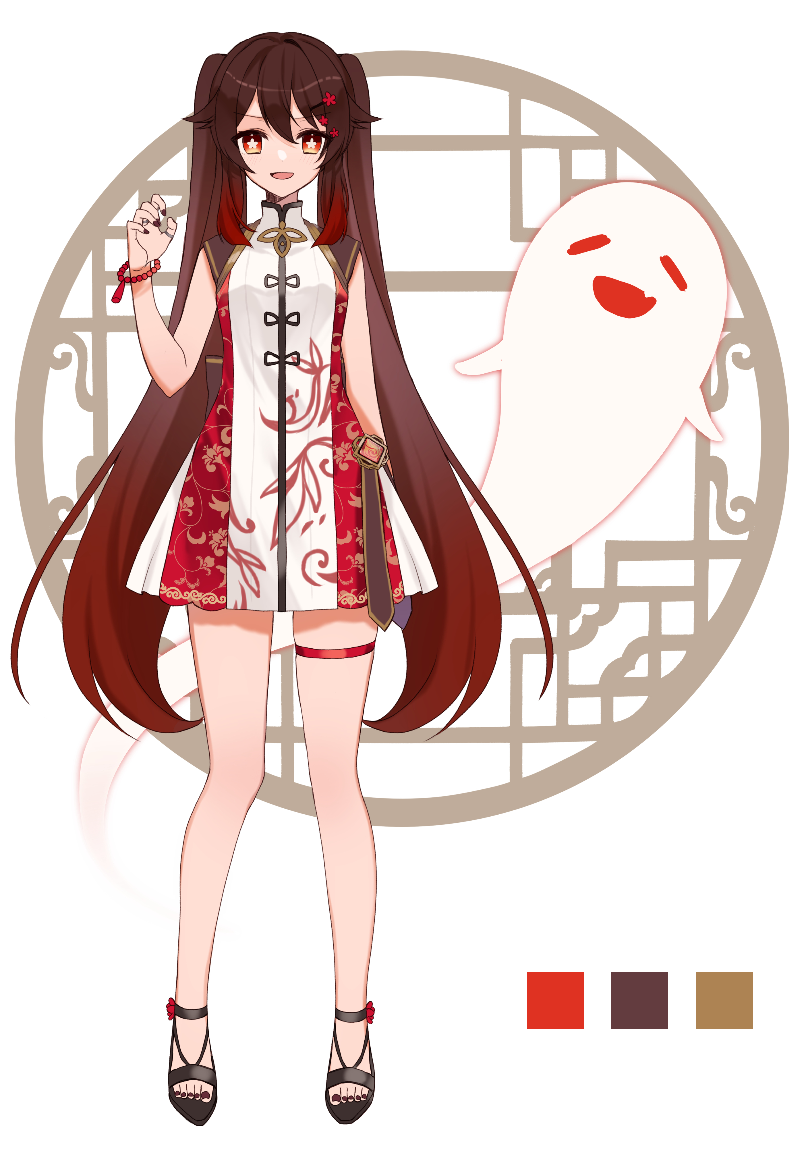 1girl :d absurdres alternate_costume bare_arms bare_legs black_footwear black_nails blush boo_tao_(genshin_impact) bracelet brown_background brown_hair chinese_clothes collared_dress color_guide colored_tips commentary_request dress flower flower-shaped_pupils full_body genshin_impact ghost gradient_hair hair_between_eyes hair_flower hair_ornament hairclip hand_up high_collar high_heel_sandals high_heels highres hu_tao_(genshin_impact) jewelry long_hair looking_at_viewer multicolored_hair nail_polish open_mouth ougi_(u_to4410) pearl_bracelet plant_print red_dress red_eyes red_flower red_hair reference_sheet ring sandals sidelocks skindentation sleeveless sleeveless_dress smile solo strappy_heels symbol-shaped_pupils thigh_strap toeless_footwear toenail_polish toenails twintails two-tone_background two-tone_dress two-tone_hair very_long_hair vision_(genshin_impact) white_background white_dress