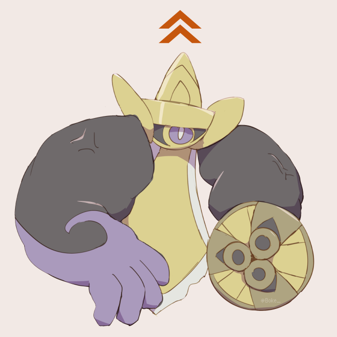 aegislash arrow_(symbol) artist_name biceps black_sclera boke-chan bright_pupils brown_background colored_sclera full_body gen_6_pokemon holding holding_shield muscular nintendo no_humans one-eyed pokemon pokemon_(creature) pokemon_mystery_dungeon purple_eyes shield simple_background sketch solo sword twitter_username veins watermark weapon white_pupils