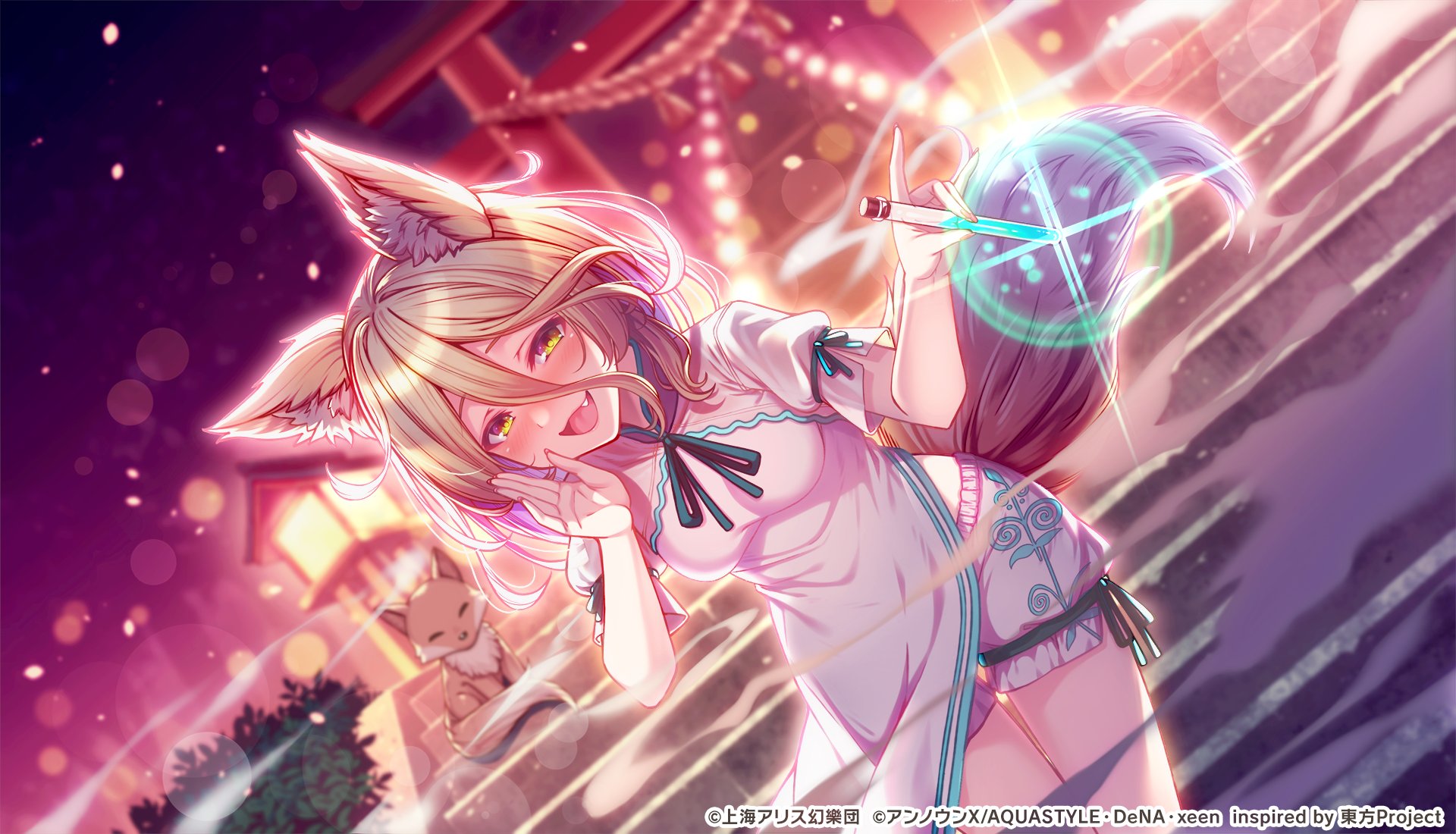 1girl animal animal_ears blonde_hair blush copyright_notice fang fox fox_ears fox_tail green_ribbon hair_between_eyes highres holding kouzuki_tsubasa_(musou_kaidou) kudamaki_tsukasa official_art open_mouth ribbon romper short_hair short_sleeves smile solo tail torii touhou touhou_danmaku_kagura white_romper yellow_eyes