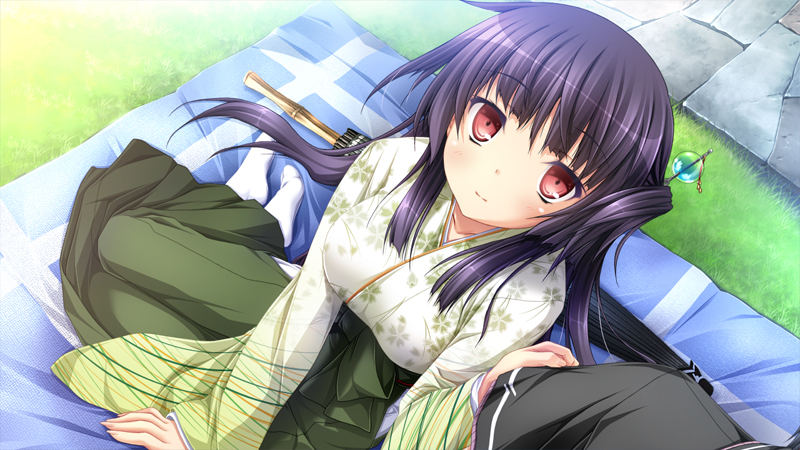 1boy 1girl black_hair black_sleeves blanket blind breasts brother_and_sister chrono_clock clothes_grab floral_print game_cg grass green_hakama hair_flaps hair_ornament hakama japanese_clothes kimono light_smile nail_(hardware) red_eyes sawatari_michiru sawatari_rei siblings grabbing_another's_sleeve socks stone_floor tsukimori_hiro umbrella white_socks