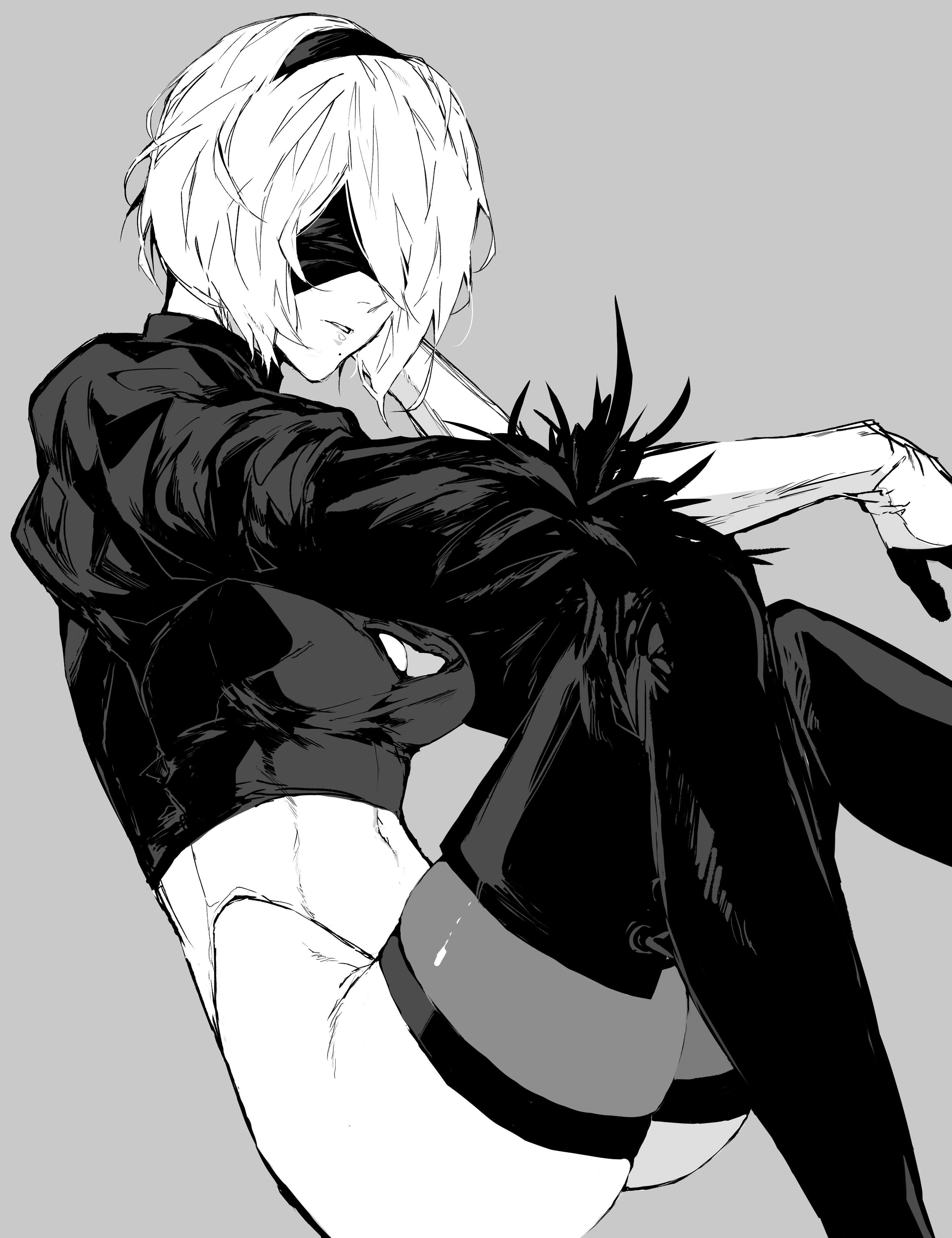 1girl 2b_(nier:automata) absurdres blindfold boots breasts elbow_gloves gloves grey_background greyscale hairband heattech_leotard highleg highres leotard mole monochrome nier:automata nier_(series) nishiii26miii open_mouth simple_background sleeved_leotard thigh_boots thighhighs turtleneck