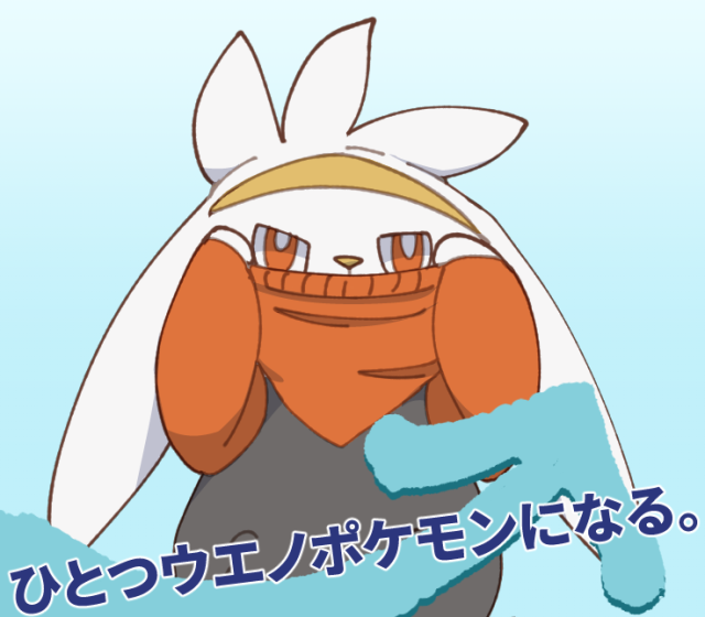 1other animal_nose arrow_(symbol) black_fur blue_background body_fur boke-chan bright_pupils covered_mouth furry gen_8_pokemon gradient_background hairband hands_up japanese_text lifting_own_clothes long_sleeves nintendo other_focus pokemon pokemon_(creature) rabbit_ears raboot red_eyes red_sweater simple_background solo straight-on sweater translated two-tone_fur upper_body white_fur white_pupils yellow_hairband