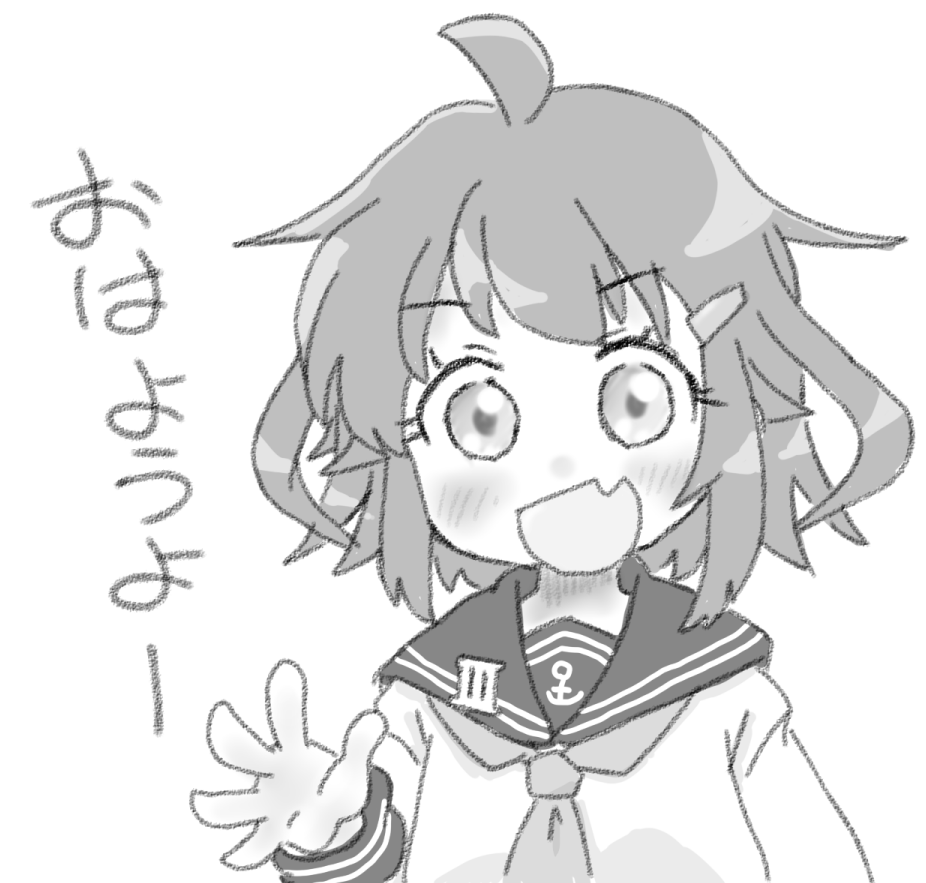 1girl anchor_symbol badge fang greyscale hair_ornament hairclip ikazuchi_(kancolle) kantai_collection monochrome neckerchief sailor_collar school_uniform serafuku short_hair skin_fang smile solo upper_body waving zatsu_(zasshu_neko)
