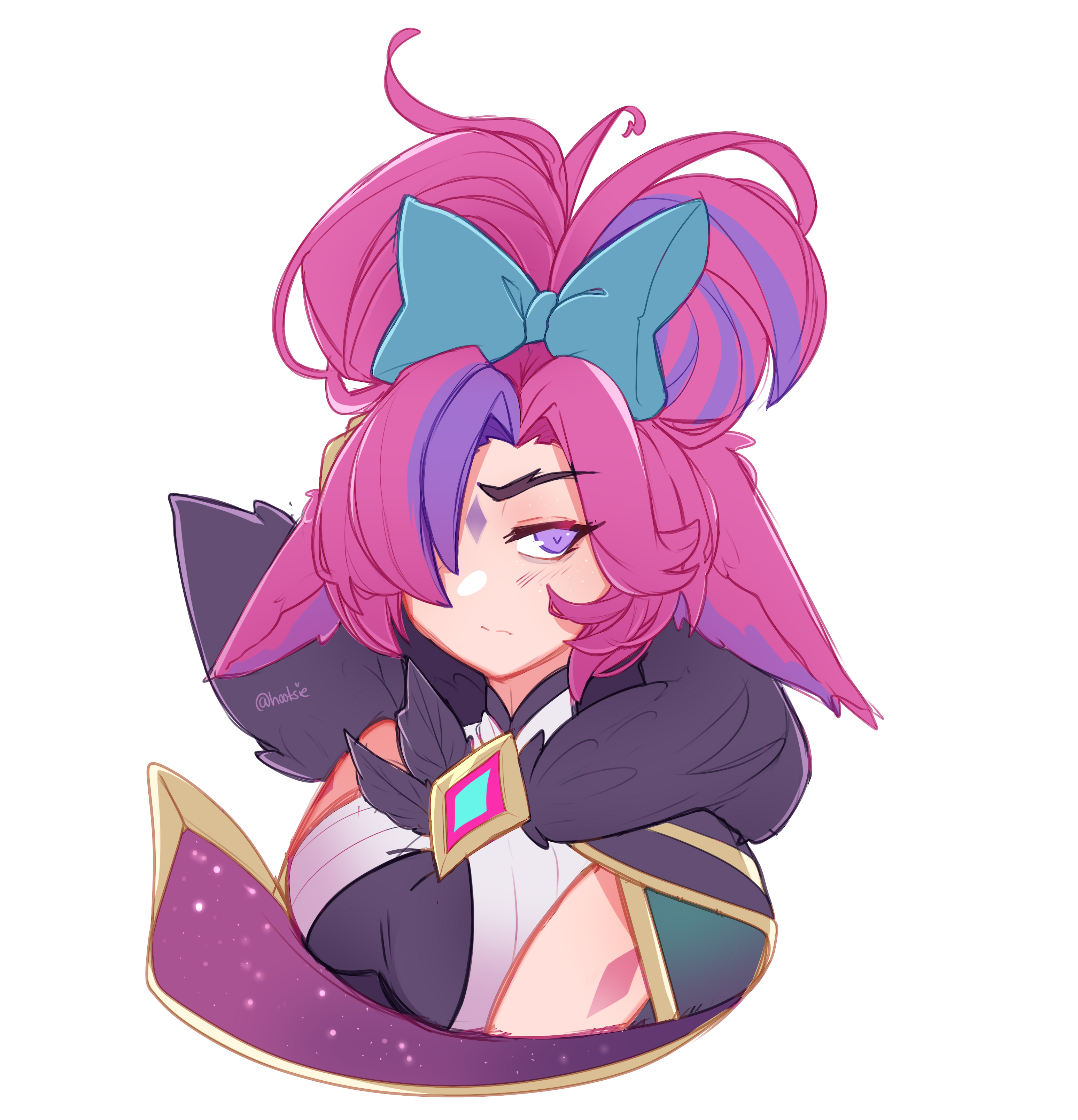 1girl absurdres animal_ears artist_name bow breasts cropped_torso gem green_bow grey_background hair_bow hair_over_one_eye highres hootsie_(hoot_sie) large_breasts league_of_legends long_hair looking_at_viewer purple_hair red_hair simple_background solo star_guardian_xayah upper_body watermark xayah