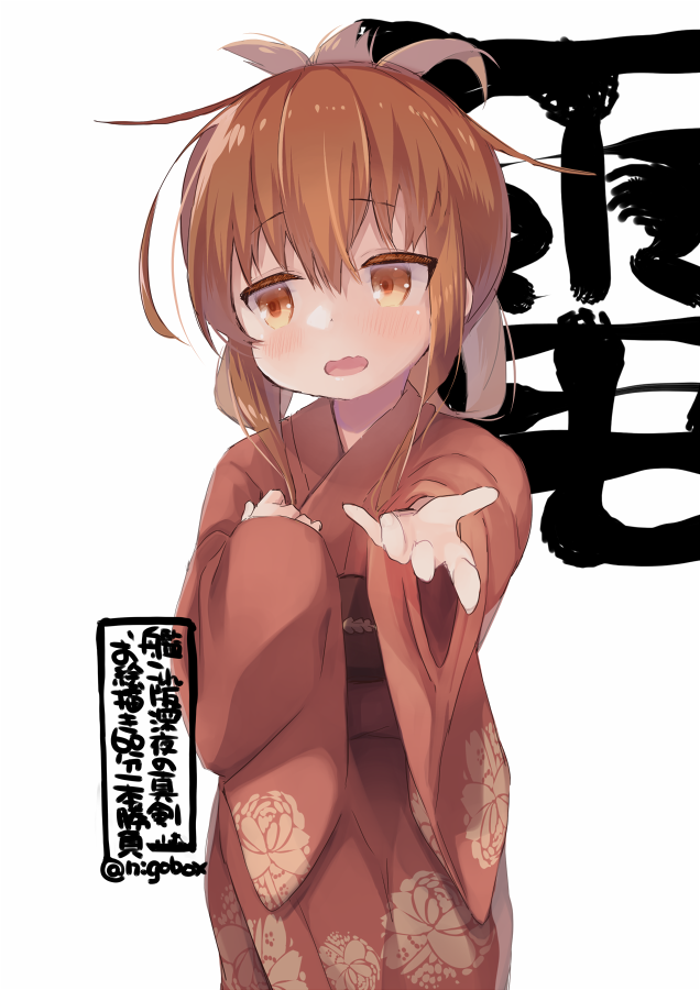 1girl blush brown_eyes brown_hair brown_kimono character_name folded_ponytail hair_between_eyes inazuma_(kancolle) inazuma_(yukata)_(kancolle) japanese_clothes kantai_collection kimono long_hair long_sleeves n:go obi official_alternate_costume one-hour_drawing_challenge open_mouth sash simple_background solo twitter_username upper_body white_background wide_sleeves