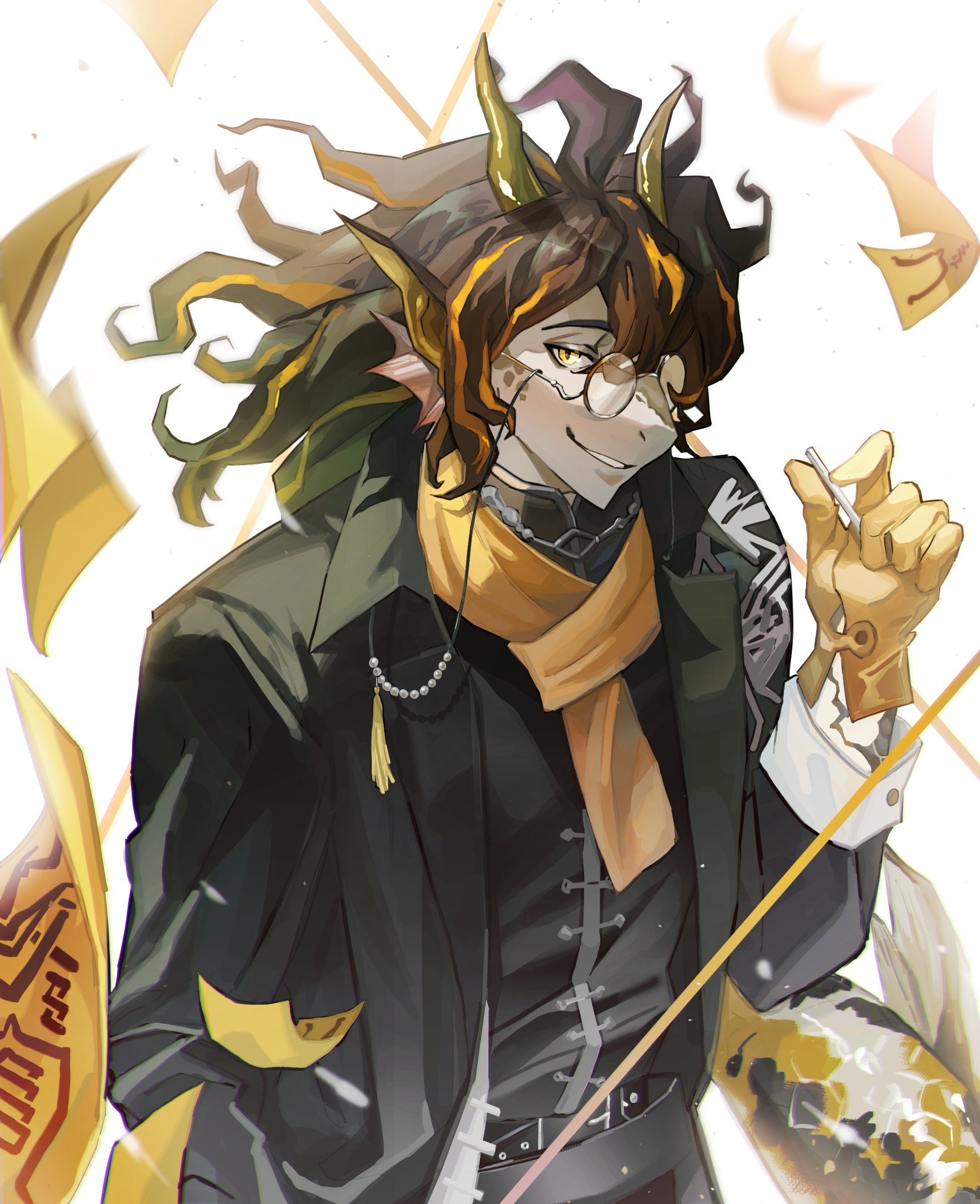 1boy arknights black_hair chinese_clothes cigarette fins furry furry_male gloves hagrang highres horns jewelry japanese_text koi lee_(arknights) long_hair male_focus necklace scarf simple_background solo white_background yellow_gloves