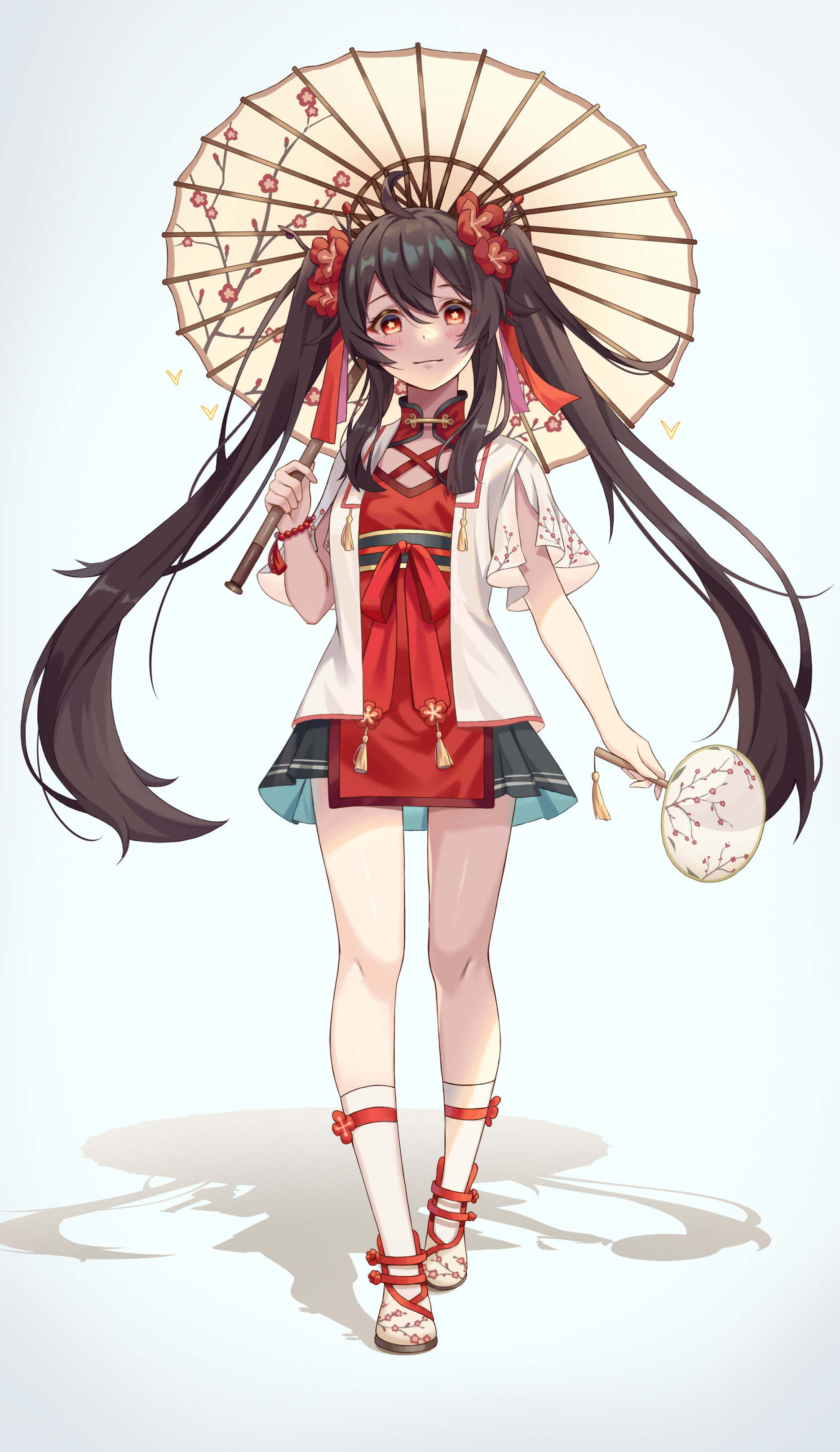 1girl absurdres alternate_costume bead_bracelet beads black_skirt blush bracelet breast_cutouts brown_hair calder_(pixiv3698273) closed_mouth commentary flower flower-shaped_pupils full_body genshin_impact hair_flower hair_ornament hand_fan highres holding holding_umbrella hu_tao_(genshin_impact) jewelry long_hair looking_at_viewer miniskirt missing_headwear oil-paper_umbrella paper_fan pleated_skirt plum_blossoms red_eyes red_shirt shirt shoes short_sleeves simple_background skirt socks solo symbol-shaped_pupils tuanshan twintails two-tone_shirt uchiwa umbrella very_long_hair white_background white_shirt white_socks