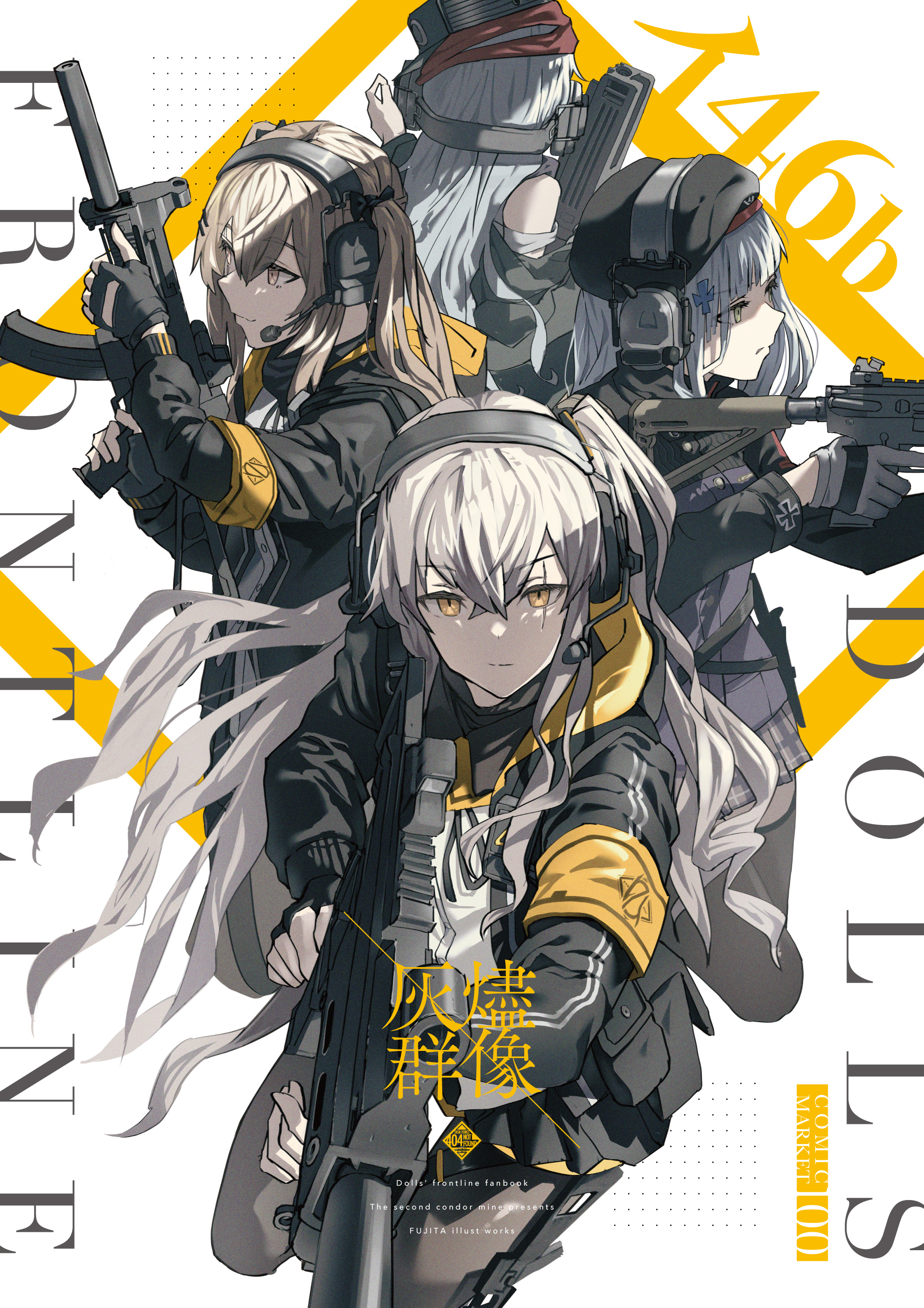 404_(girls'_frontline) 4girls absurdres assault_rifle bare_shoulders beret black_gloves black_jacket black_skirt blunt_bangs brown_eyes brown_hair bullpup caseless_firearm closed_mouth comiket_100 commentary_request copyright_name english_text feet_out_of_frame fingerless_gloves fujita_(condor) g11_(girls'_frontline) girls'_frontline gloves green_eyes grey_hair gun h&k_g11 h&k_hk416 h&k_ump h&k_ump h&k_ump hair_between_eyes hair_ornament hair_ribbon hairclip hat headset highres hk416_(girls'_frontline) holding holding_gun holding_weapon jacket long_hair military_jacket multiple_girls one_side_up orange_eyes pantyhose pleated_skirt ribbon rifle scar scar_across_eye scar_on_face serious shirt simple_background skirt smile submachine_gun suppressor text_background translation_request twintails ump45_(girls'_frontline) ump9_(girls'_frontline) weapon white_background white_hair white_shirt