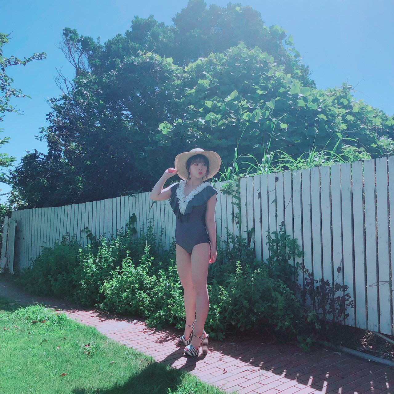 1girl blue_sky hat highres itou_ayasa one-piece_swimsuit photo_(medium) sky straw_hat swimsuit tree