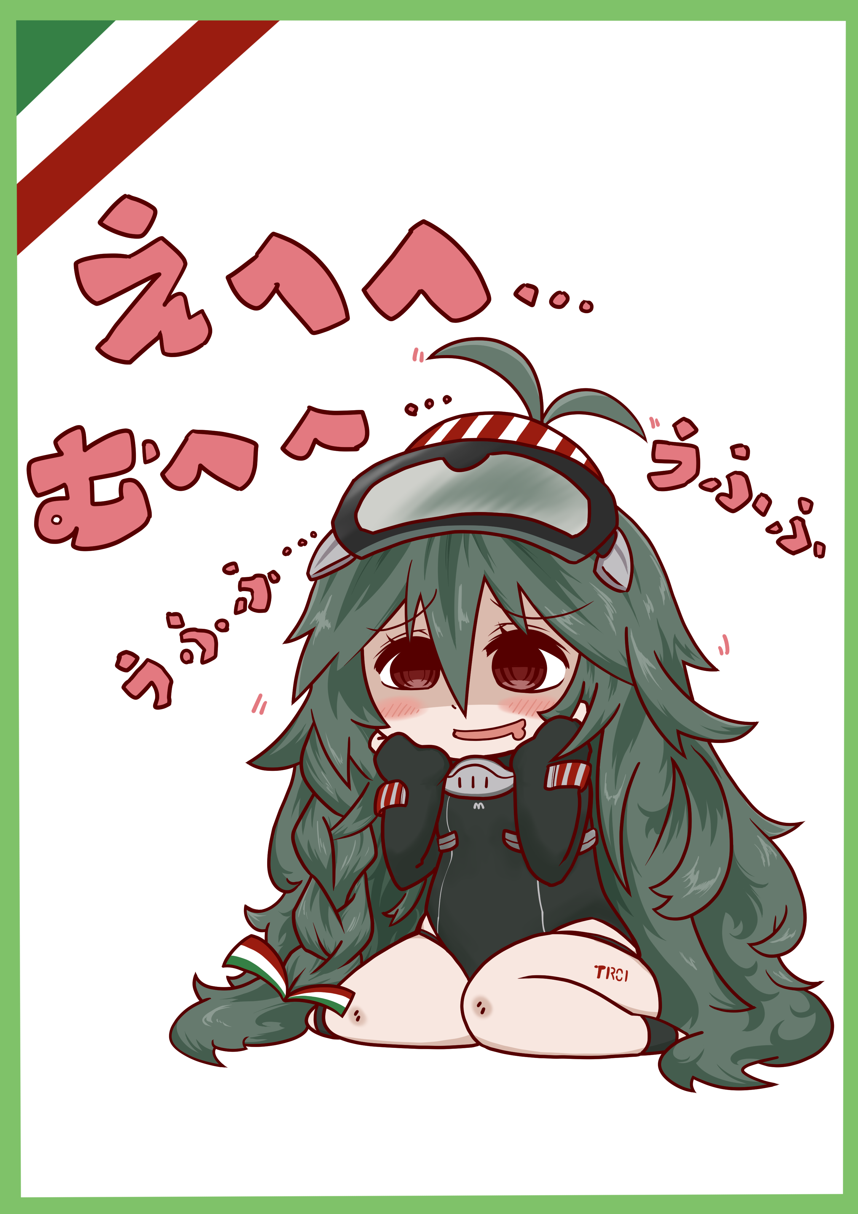 1girl @_@ absurdres antenna_hair azur_lane blush blush_stickers bodysuit border braid chibi commentary_request daigorou_(42036928) diving_mask diving_mask_on_head diving_suit drooling full_body goggles goggles_on_head green_border green_hair hair_between_eyes hands_on_own_cheeks hands_on_own_face highleg_springsuit highres italian_flag leg_tattoo long_hair motion_lines mouth_drool open_mouth red_eyes shaded_face sidelocks simple_background sitting smile solo springsuit tattoo torricelli_(azur_lane) translation_request very_long_hair wariza wetsuit white_background