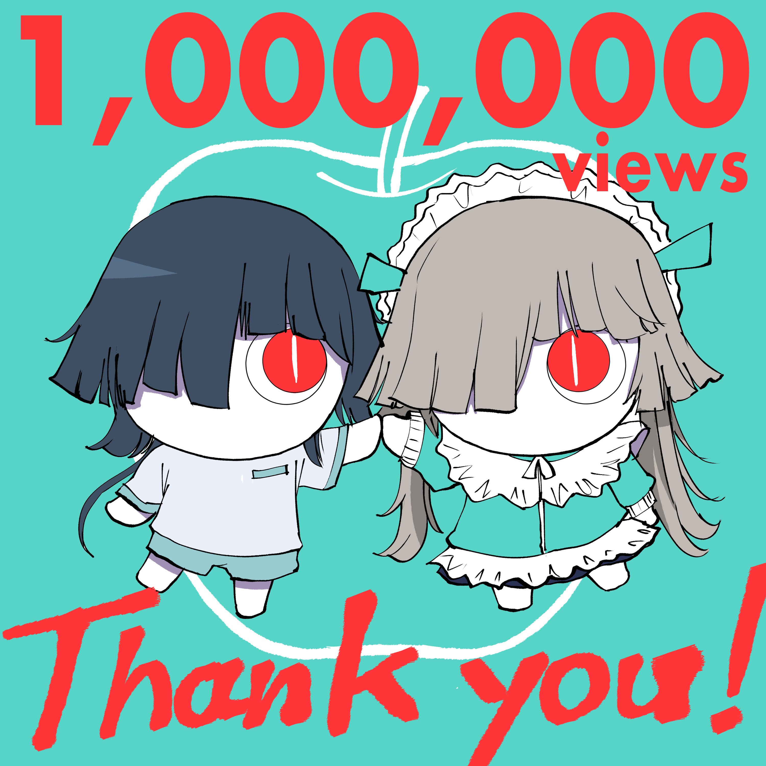 2girls absurdres aimaina apple aqua_background aqua_jacket aqua_ribbon aqua_shorts arm_at_side asymmetrical_bangs black_hair blunt_bangs blunt_ends breast_pocket chibi collar colored_skin dual_persona english_text food frilled_collar frills fruit grey_hair hair_ribbon hand_to_hand hand_up highres jacket long_sleeves looking_at_another maid_headdress mixed-language_commentary multiple_girls neck_ribbon no_eyebrows no_feet no_hands no_mouth no_nose official_art pinocchio-p pocket red_eyes ribbon shirt shorts simple_background skirt t-shirt tensei_ringo_(vocaloid) track_jacket twintails vocaloid white_ribbon white_shirt white_skin white_skirt