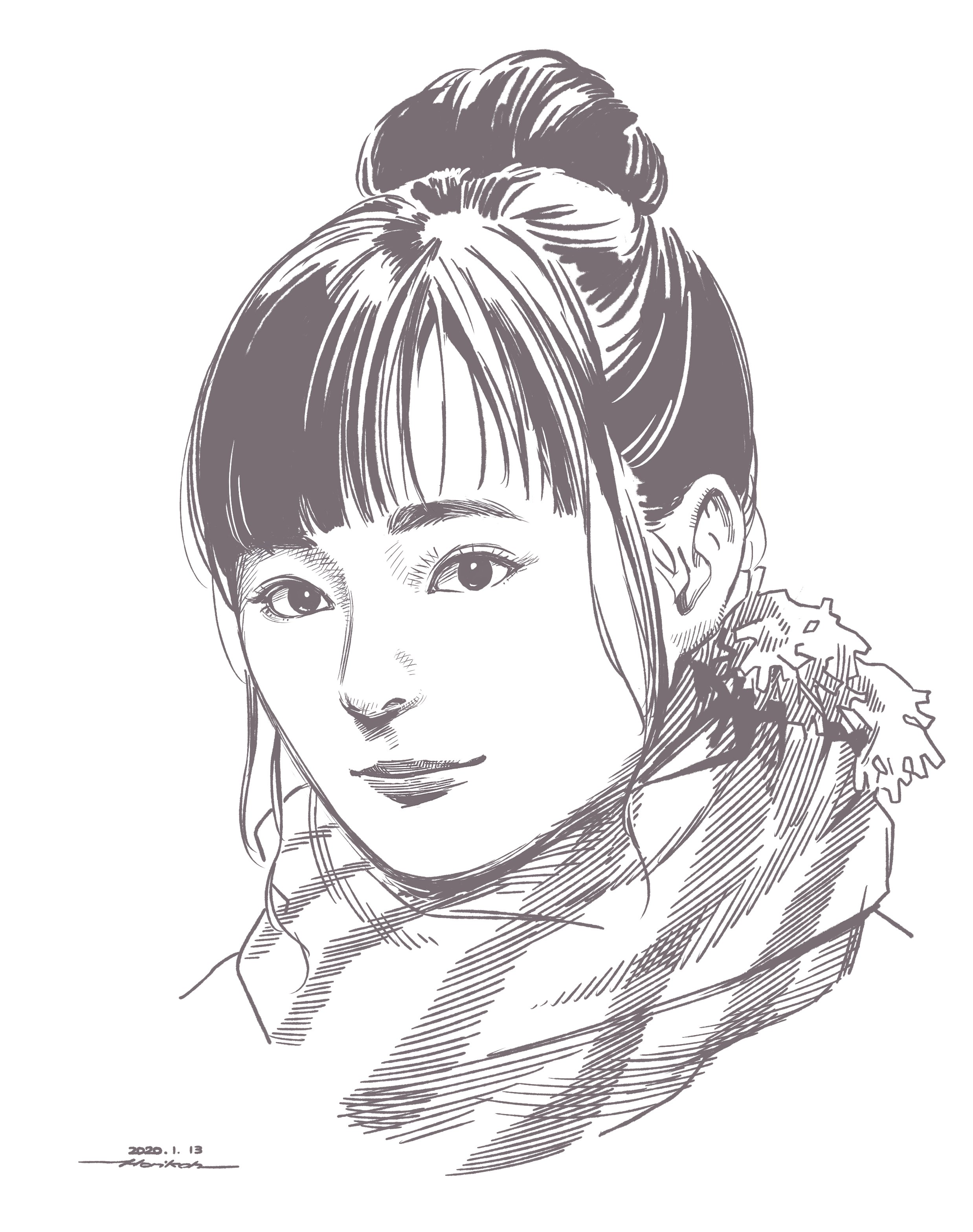 1girl absurdres closed_mouth cosplay dated fukuhara_haruka_(voice_actress) greyscale hair_bun highres horikou looking_at_viewer monochrome portrait realistic scarf shima_rin shima_rin_(cosplay) signature simple_background single_hair_bun smile solo voice_actor_connection white_background yurucamp yurucamp_(live_action)