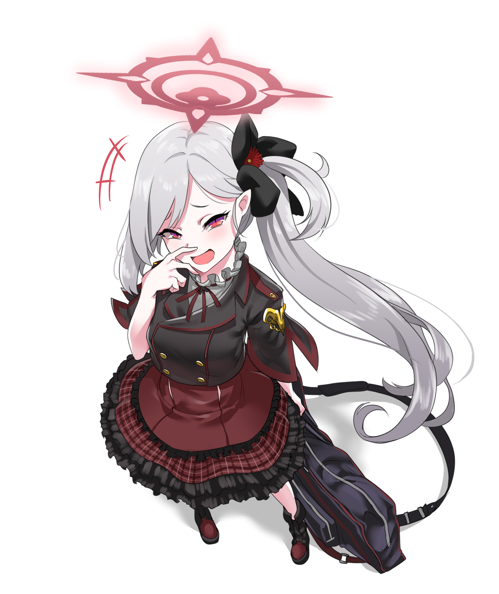 1girl bag blue_archive blush bow flower frills from_above hair_flower hair_ornament halo hand_to_own_mouth highres holding holding_bag long_hair looking_at_viewer mutsuki_(blue_archive) open_mouth pointy_ears purple_eyes red_eyes side_ponytail simple_background skirt smile smug solo tscplayer very_long_hair white_background white_hair