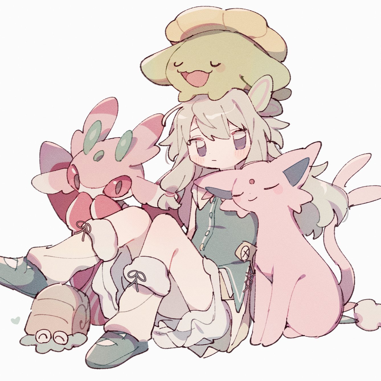 1girl ^_^ blush butterfly_hair_ornament closed_eyes closed_mouth commentary_request espeon film_grain gen_1_pokemon gen_2_pokemon gen_7_pokemon green_footwear green_hair hair_ornament highres kusanagi_nene leg_warmers long_hair looking_at_viewer lurantis nintendo nodori710 nuzzle omanyte on_floor pokemon pokemon_(creature) project_sekai purple_eyes shell simple_background sitting skiploom skirt u_u white_background white_leg_warmers yellow_skirt
