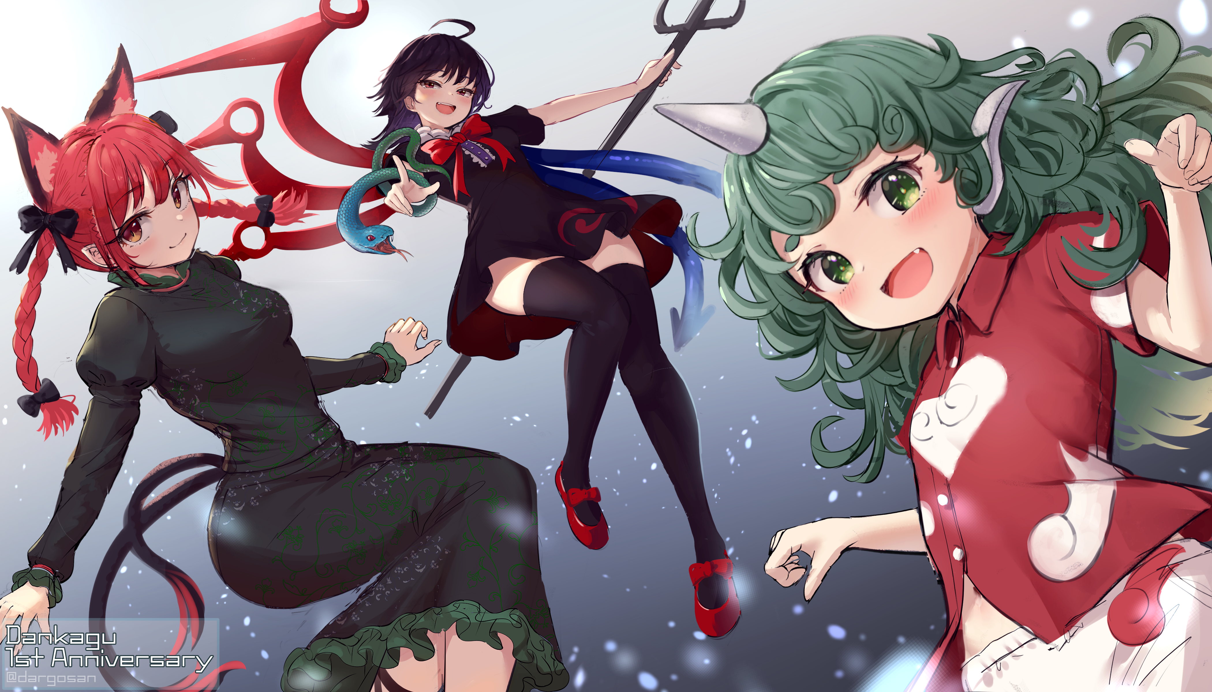 3girls :d absurdres ahoge animal_ears black_dress black_hair black_thighhighs bow bowtie braid breasts cat_ears cat_tail dargo dress fang feet_out_of_frame flat_chest gradient_background green_dress green_eyes green_hair grey_background hair_bow highres horns houjuu_nue kaenbyou_rin komano_aunn long_hair long_sleeves looking_at_viewer multiple_girls multiple_tails open_mouth paw_pose pointy_ears red_bow red_bowtie red_eyes red_footwear red_hair shoes short_sleeves simple_background single_horn smile tail thighhighs touhou touhou_danmaku_kagura twin_braids wings zettai_ryouiki