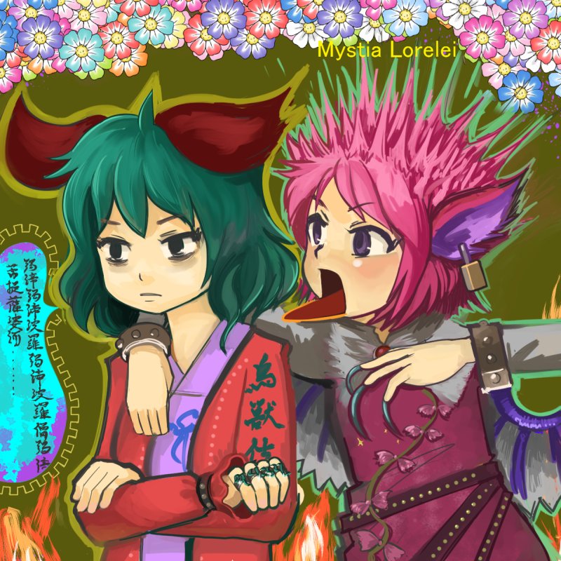 2girls animal_ears bags_under_eyes bird_ears bird_wings blue_flower brown_dress character_name choujuu_gigaku clothes_writing dog_ears dress fingernails flower green_flower green_hair green_nails heart_sutra jacket jewelry kasodani_kyouko long_fingernails long_sleeves maku_(wasabishock) multiple_girls mystia_lorelei nail_polish missing_headwear open_clothes open_jacket open_mouth orange_flower pink_flower pink_hair pink_jacket purple_eyes purple_flower red_flower ring sharp_fingernails short_hair speech_bubble touhou translation_request white_flower white_wings wings yellow_flower