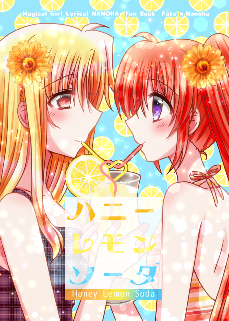 2girls blonde_hair blush comiket_100 couple cover drink drinking_straw fate_testarossa food fruit happy lemon lemon_slice long_hair lyrical_nanoha mahou_shoujo_lyrical_nanoha_strikers multiple_girls nanashiki orange_hair purple_eyes red_eyes side_ponytail smile takamachi_nanoha very_long_hair yuri
