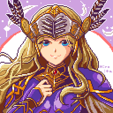 1girl armor blonde_hair blue_eyes feathers helmet hiroita long_hair lowres pixel_art purple_armor silmeria_valkyrie valkyrie valkyrie_profile_(series) valkyrie_profile_2:_silmeria winged_helmet