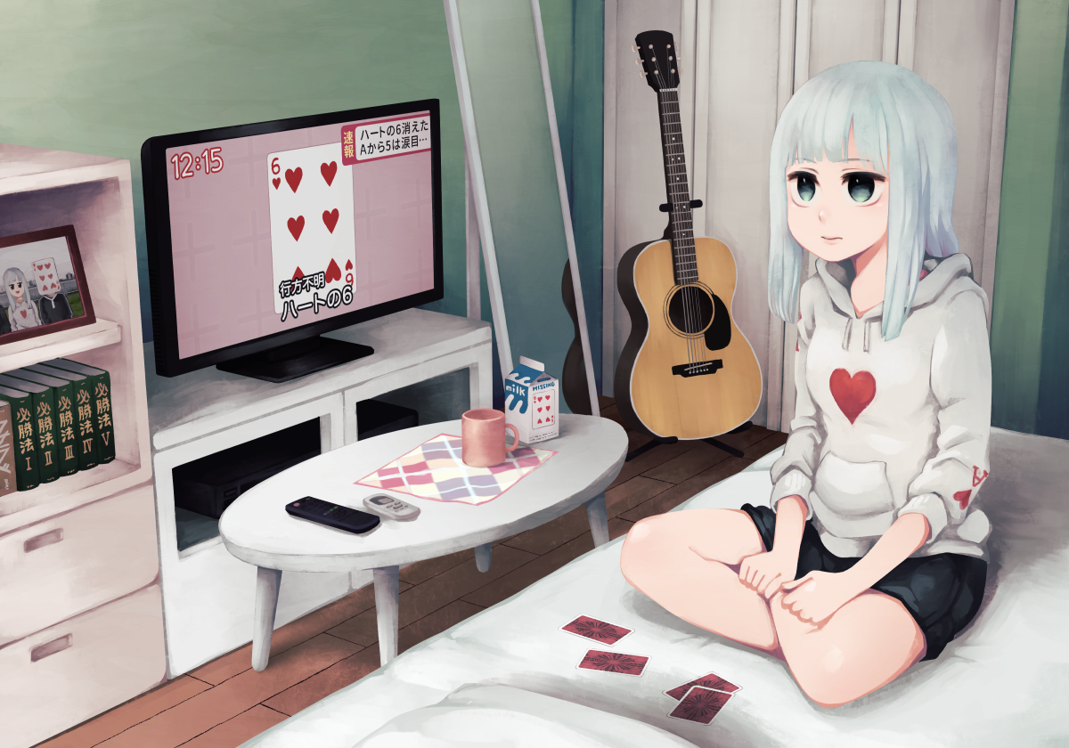 1girl bed book bookshelf card closet controller drink_carton grey_eyes guitar heart hood hoodie indoors instrument long_hair milk_carton mirror original pillow playing_card print_hoodie remote_control shadow solo table television white_hair white_hoodie wide_shot yajirushi_(chanoma)