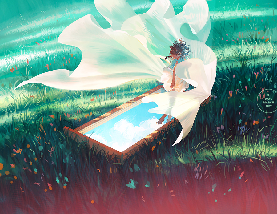 1girl arms_at_sides bare_legs barefoot black_eyes blue_sky blunt_bangs brown_hair capelet closed_mouth cloud cloudy_sky crossed_legs curtains dark-skinned_female dark_skin day door double_exposure dress fantasy floating_hair grass light loika looking_down medium_hair messy_hair original outdoors serious sitting sky solo sunlight white_capelet white_dress wind wind_lift