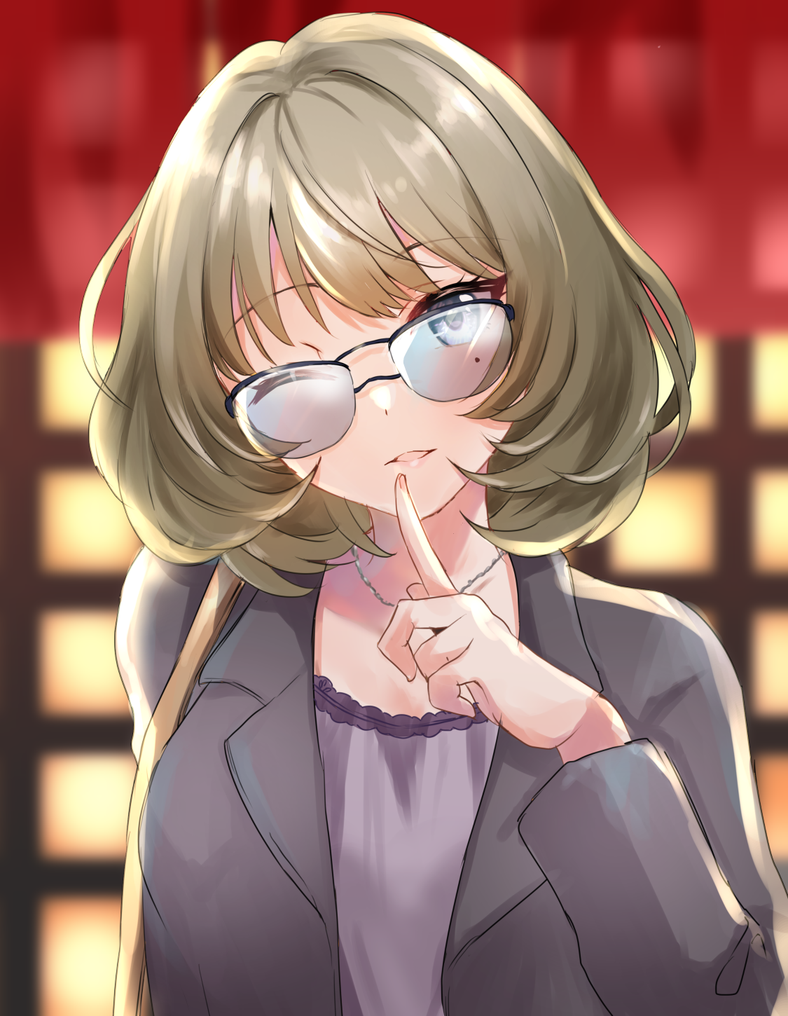 1girl black-framed_eyewear blazer blurry blurry_background brown_hair chii_(sbshop) glasses grey-tinted_eyewear grey_shirt highres idolmaster idolmaster_cinderella_girls jacket jewelry long_hair long_sleeves looking_at_viewer mole mole_under_eye necklace one_eye_closed open_clothes open_jacket open_mouth shirt solo straight_hair takagaki_kaede tinted_eyewear upper_body